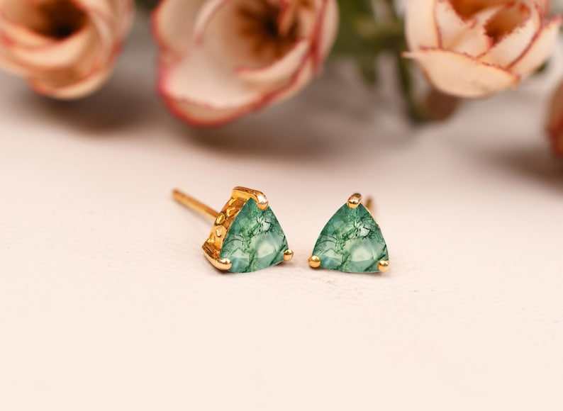 Trilliant Moss Agate Stud Earrings Sterling Silver Green Earrings Agate Jewelry Unique Green Stone Studs