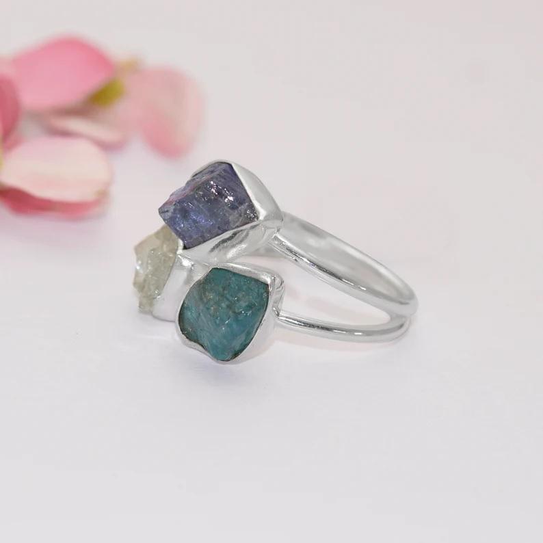 Trio Multi Rough Stone Ring Aquamarine Tanzanite Apatite Sterling Silver Three Stone Triple Band Ring for Women