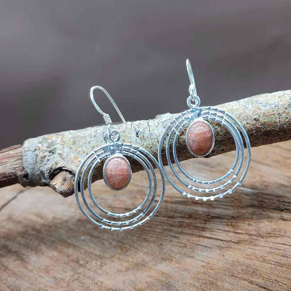 Triple Layer Boho Style Danglers Handmade Oval Shape Natural Sunstone Earrings with Pearl and Diamond Sterling Silver-for Gift