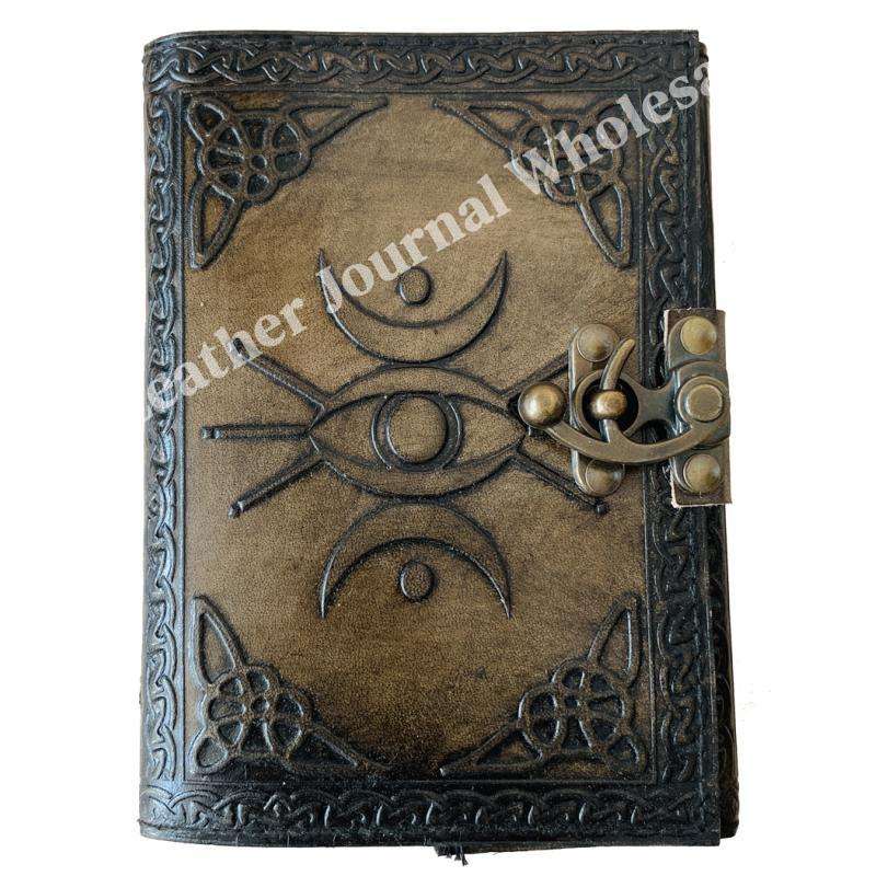 Triple Moon Goddess Eye Embossed Handmade Genuine Leather Journal School Supplies Notebook Brass C-Lock Hard Cover Vintage Diary