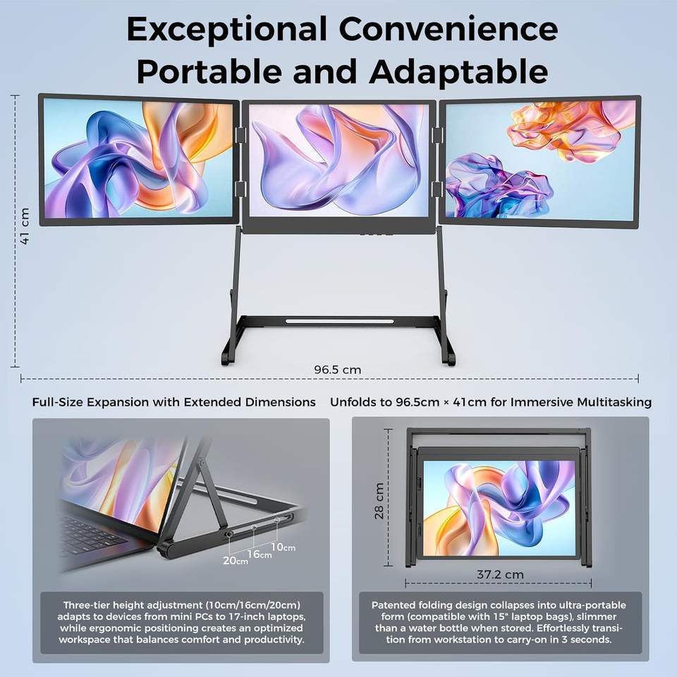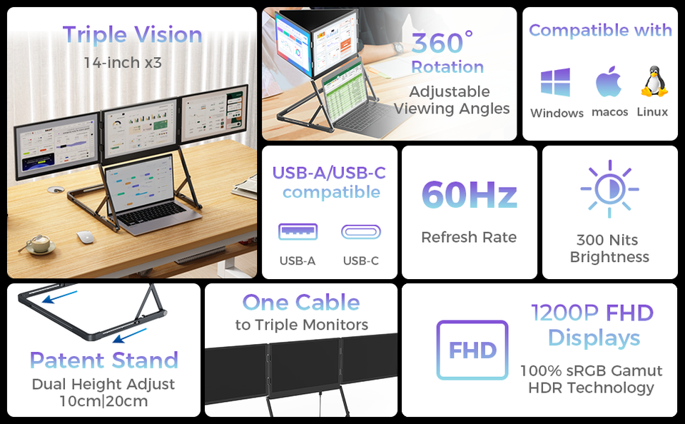Triple Screen Monitor TriCreate Lite Factory Custom 14" FHD IPS Screen Extender Compatible with Windows/Android/PS4/MacBook
