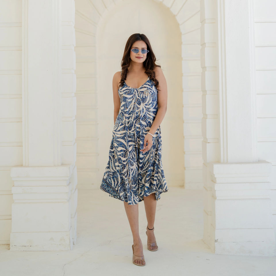 Tropical Blue and White Palm Leaf Print Summer Midi Dress Exotic Island Vacation Sundress Sleeveless Botanical Beachwear Gown