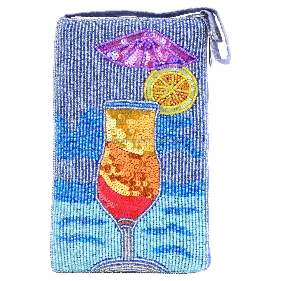Tropical Cocktail Beaded Mobile Pouch | Beach Drink Design Phone Bag | Handmade Sequin Crossbody Purse for Summer & Travel