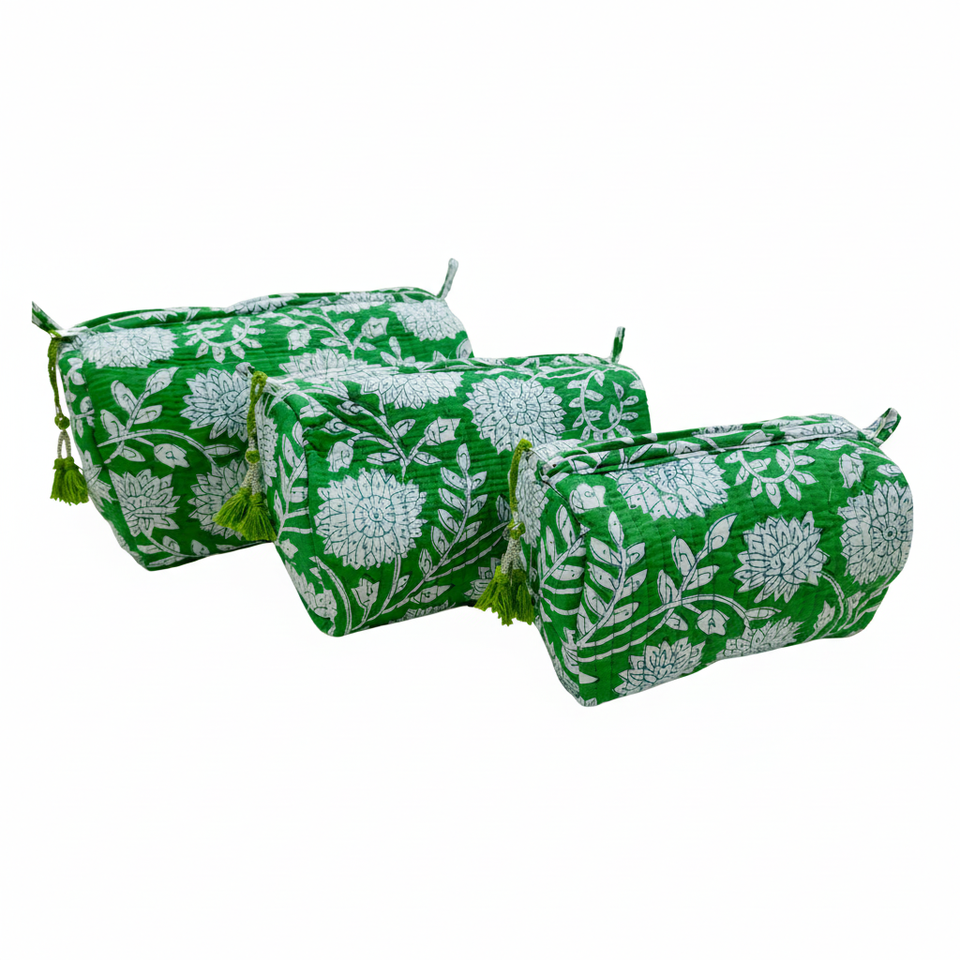 Tropical Green Floral Quilted Toiletry Bag Set - Vibrant & Eco-Friendly