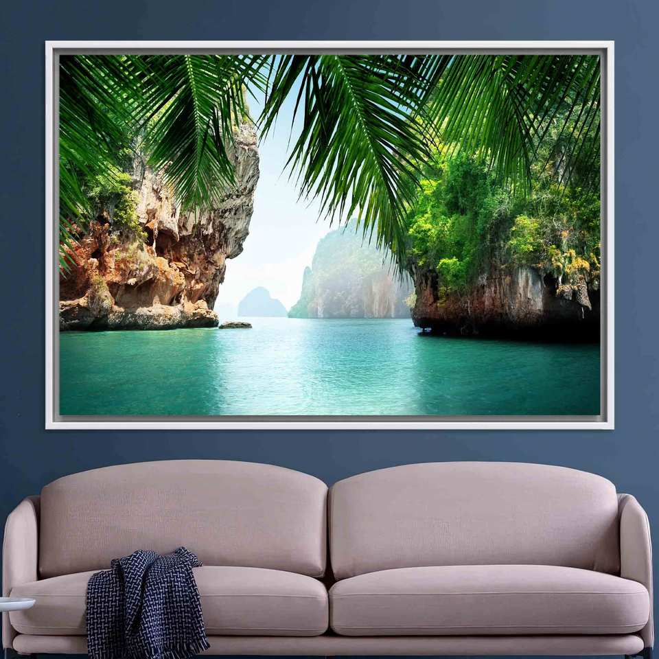 Tropical Thai Bay Tempered Glass Print: Sea View Canvas Decor,WHITE FRAMED CANVAS