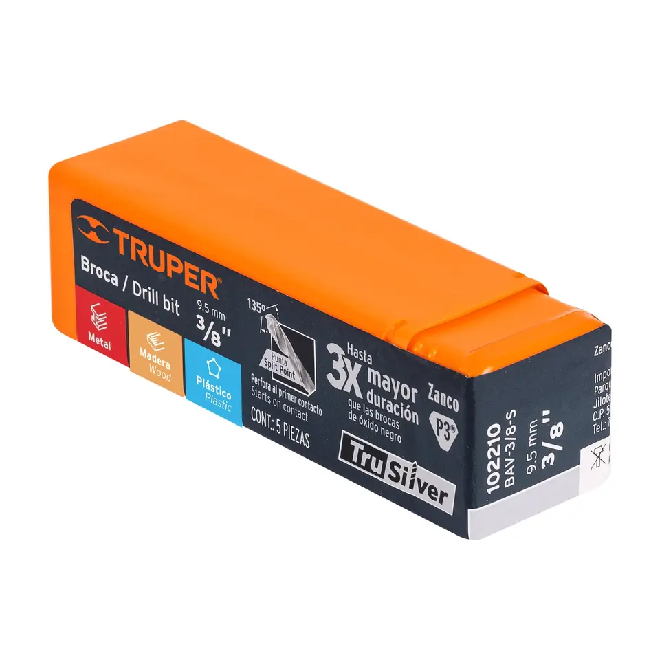 Truper 3/8' High Speed Steel Drill Bit Set Din338 Standard Straight Shank Twist Processed 5 Units in a Box for Metal
