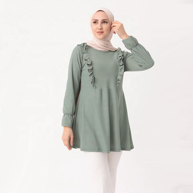 Turkey Women Pleated Muslim Blouse Elegant Long Sleeve Crew Neck Tunic Shirts Tops Blouse