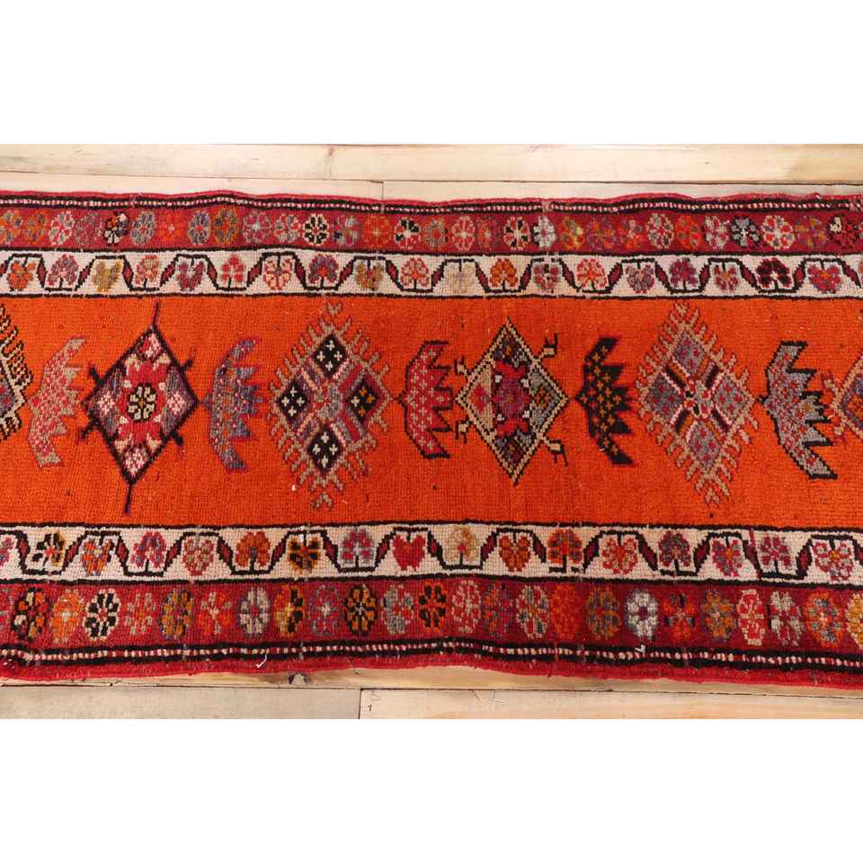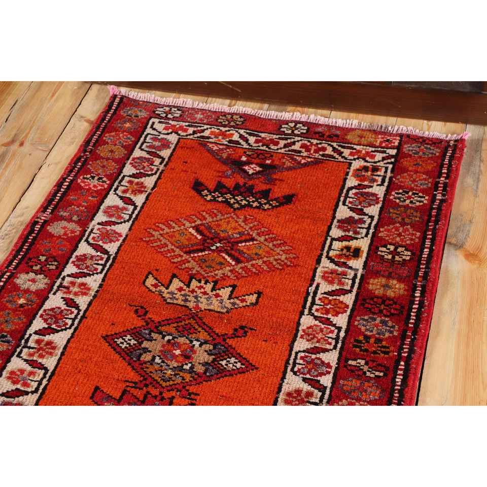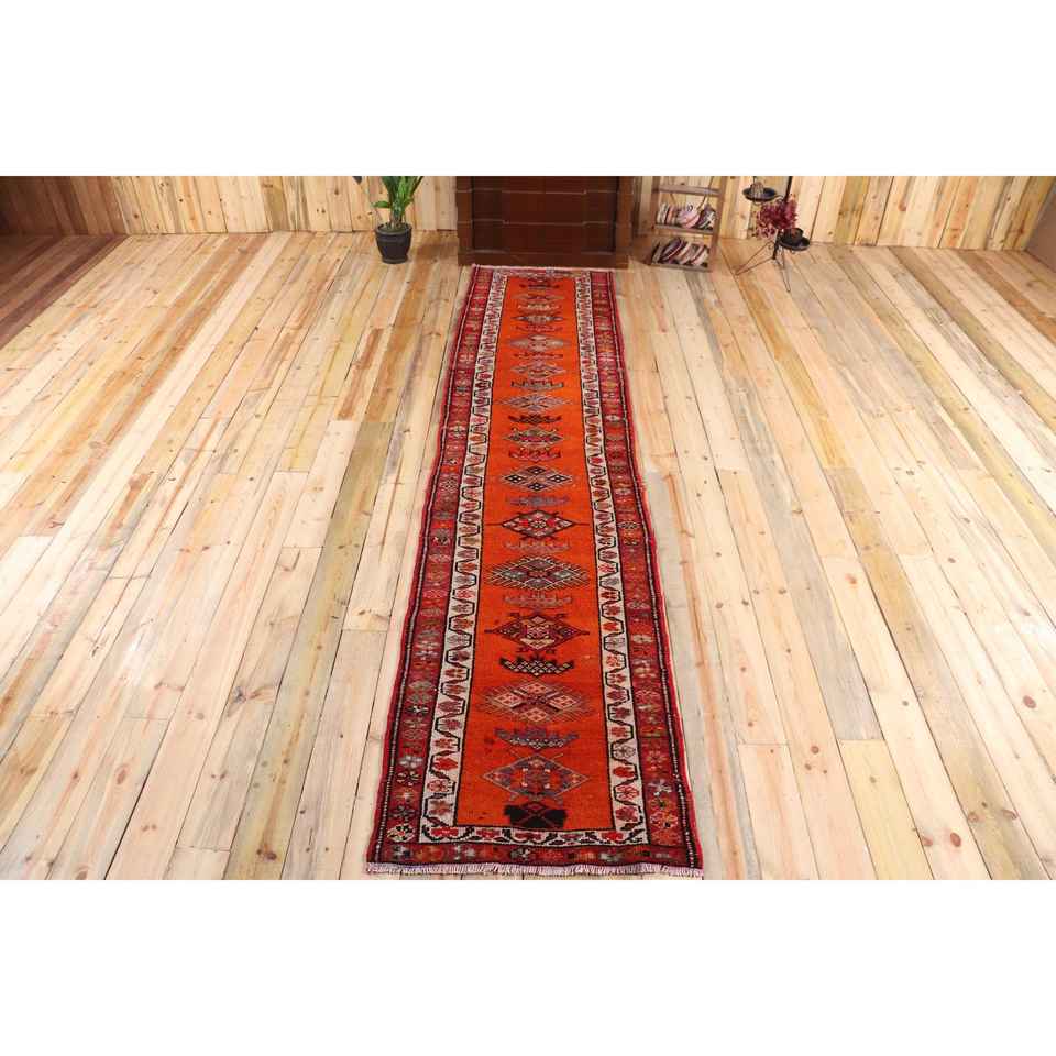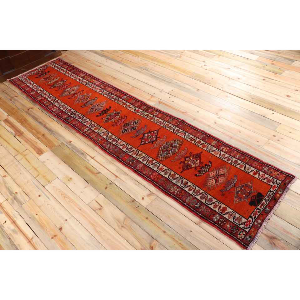 Turkish 2.6x11.7 ft Rug, Herki Vintage Rug, Red Camouflage Wool Rug