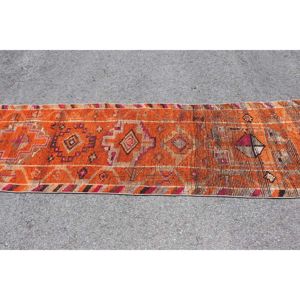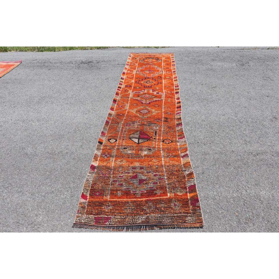 Turkish 2.8x12.8 ft Rug, Runner Vintage Rug, Orange Red Animal Print Rug