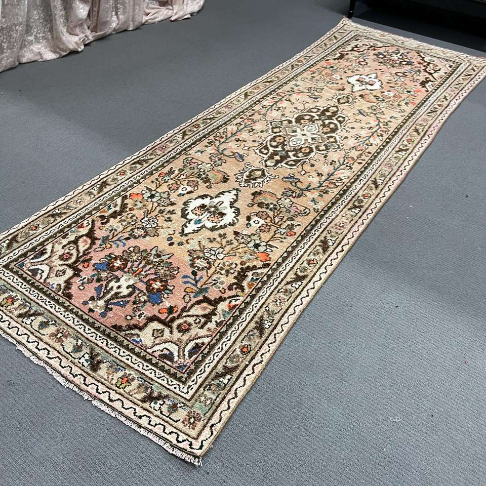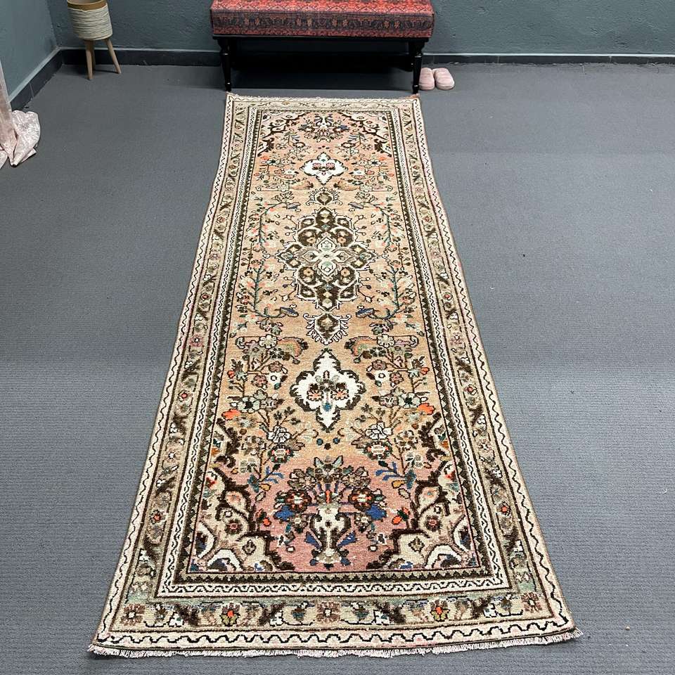 Turkish 3.5x10.4 ft Rug, Vintage Runner Rug, Brown Floral Rug