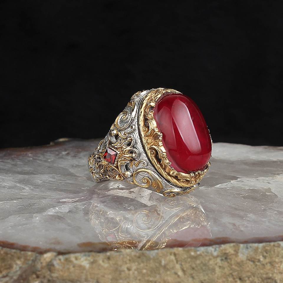 Turkish Jewelry Black Men's 925 Sterling Ottoman Style Ring Rhodium and Gold Bi-color Plating Model RCEGYT-563