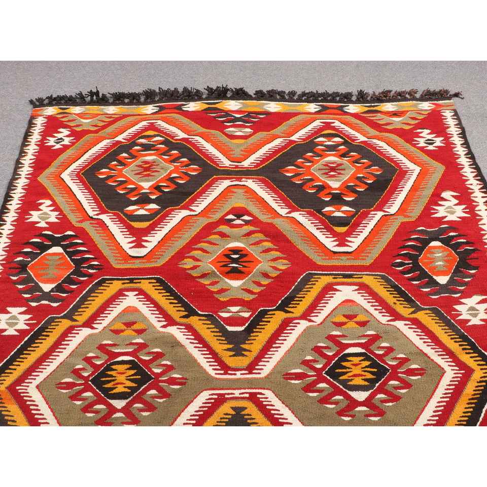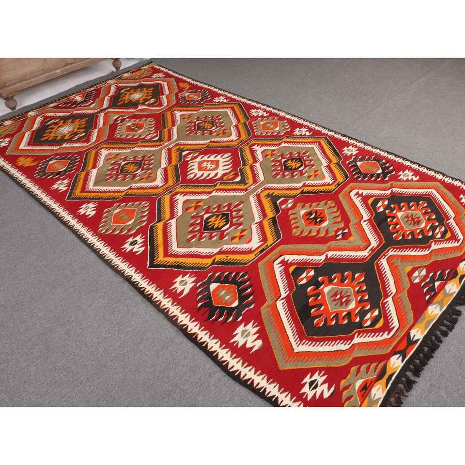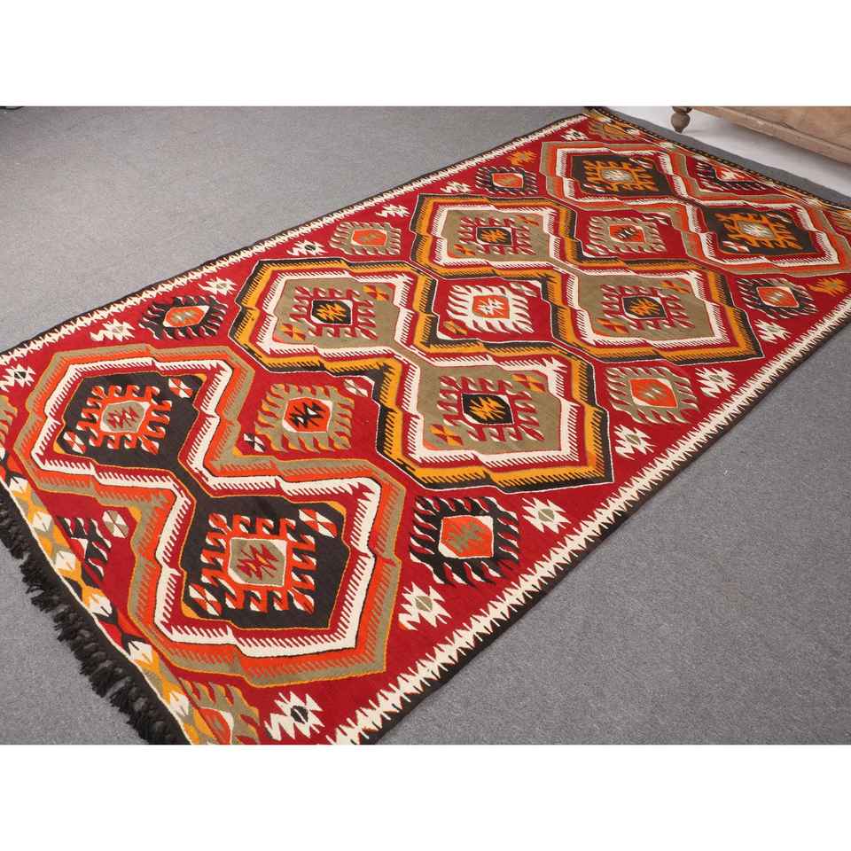 Turkish Kilim Large Rug 5.2x9.5 ft (160x291 cm), Vintage Red Animal Print Wool Rug