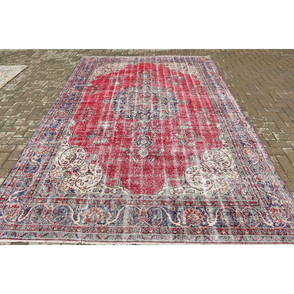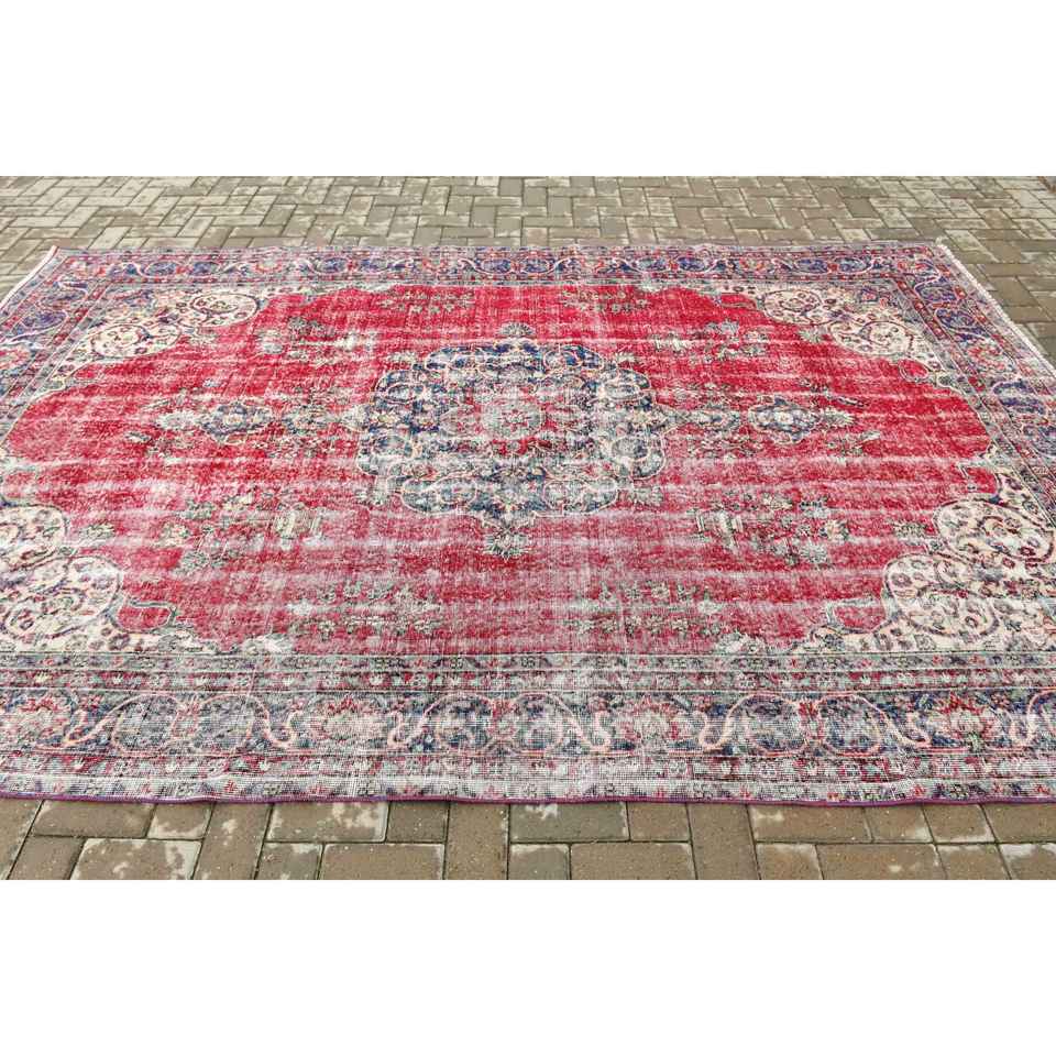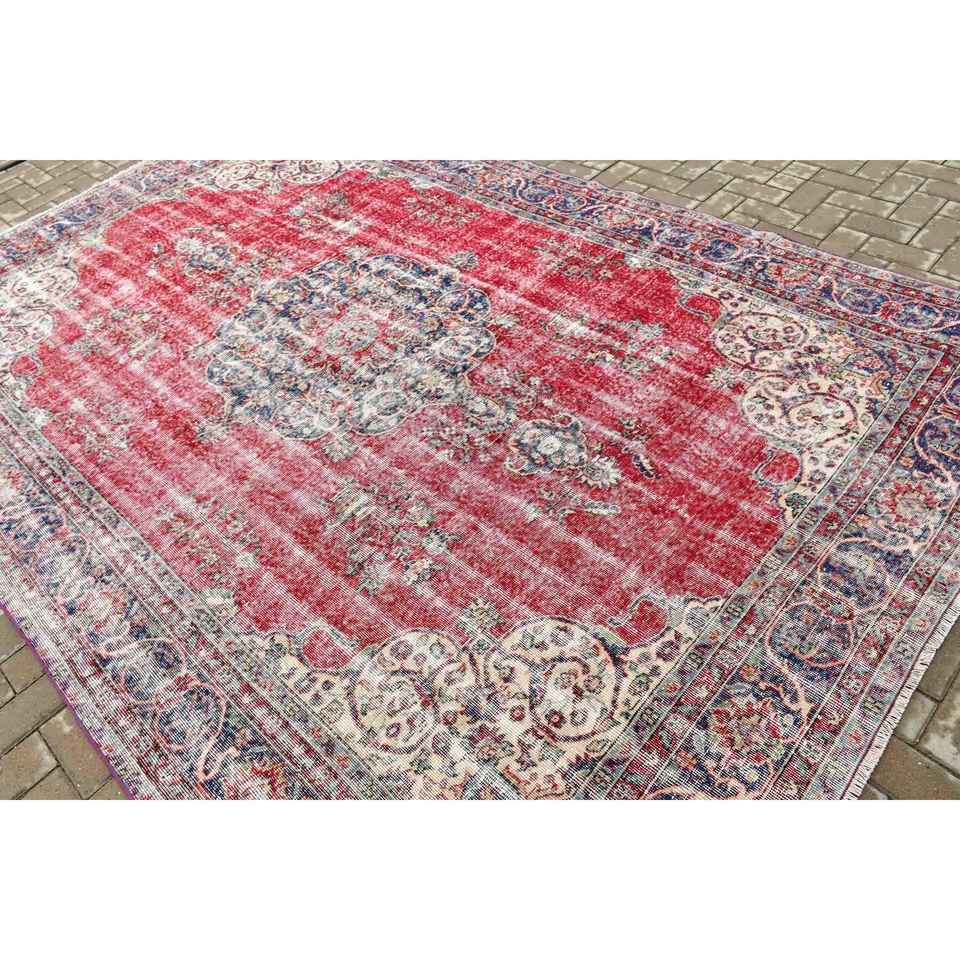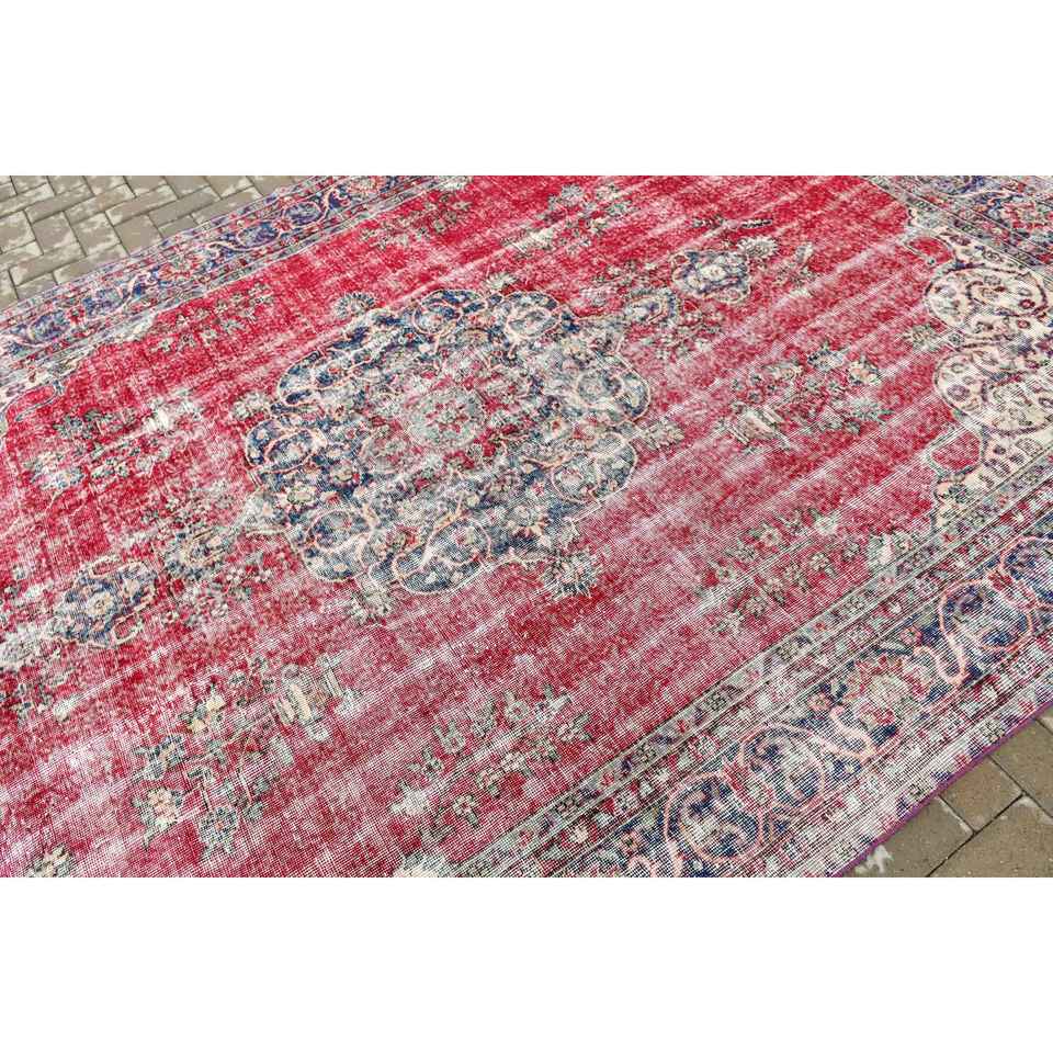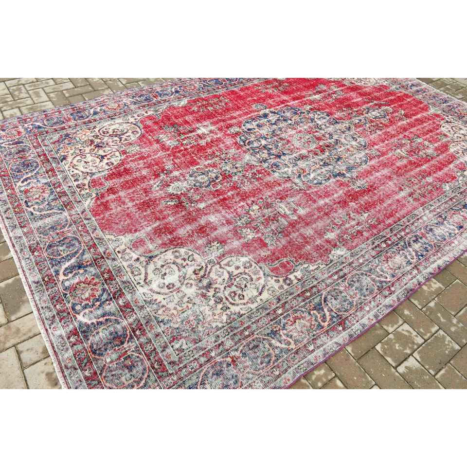 Turkish Large Rug 7.1x9.8 ft, Red Blue Striped Rug Wool