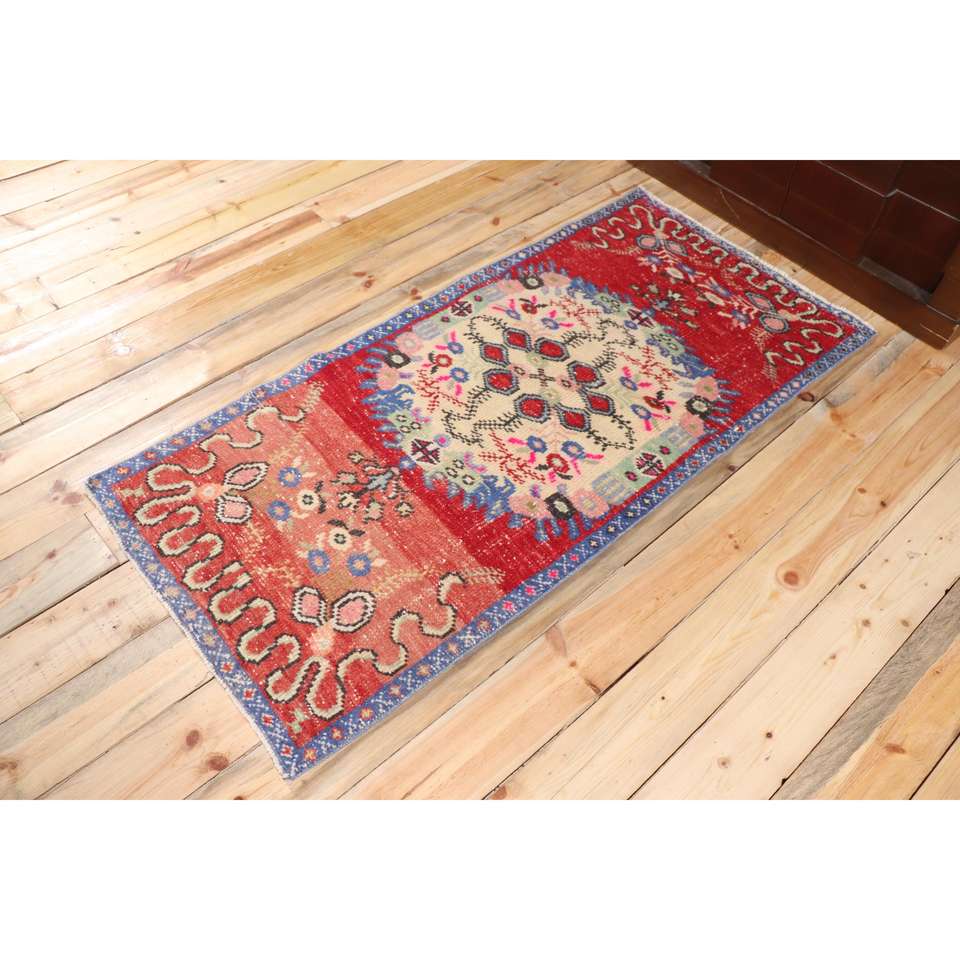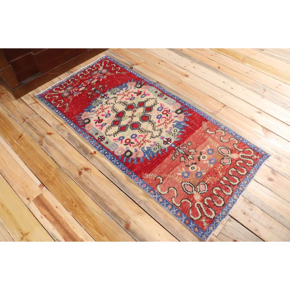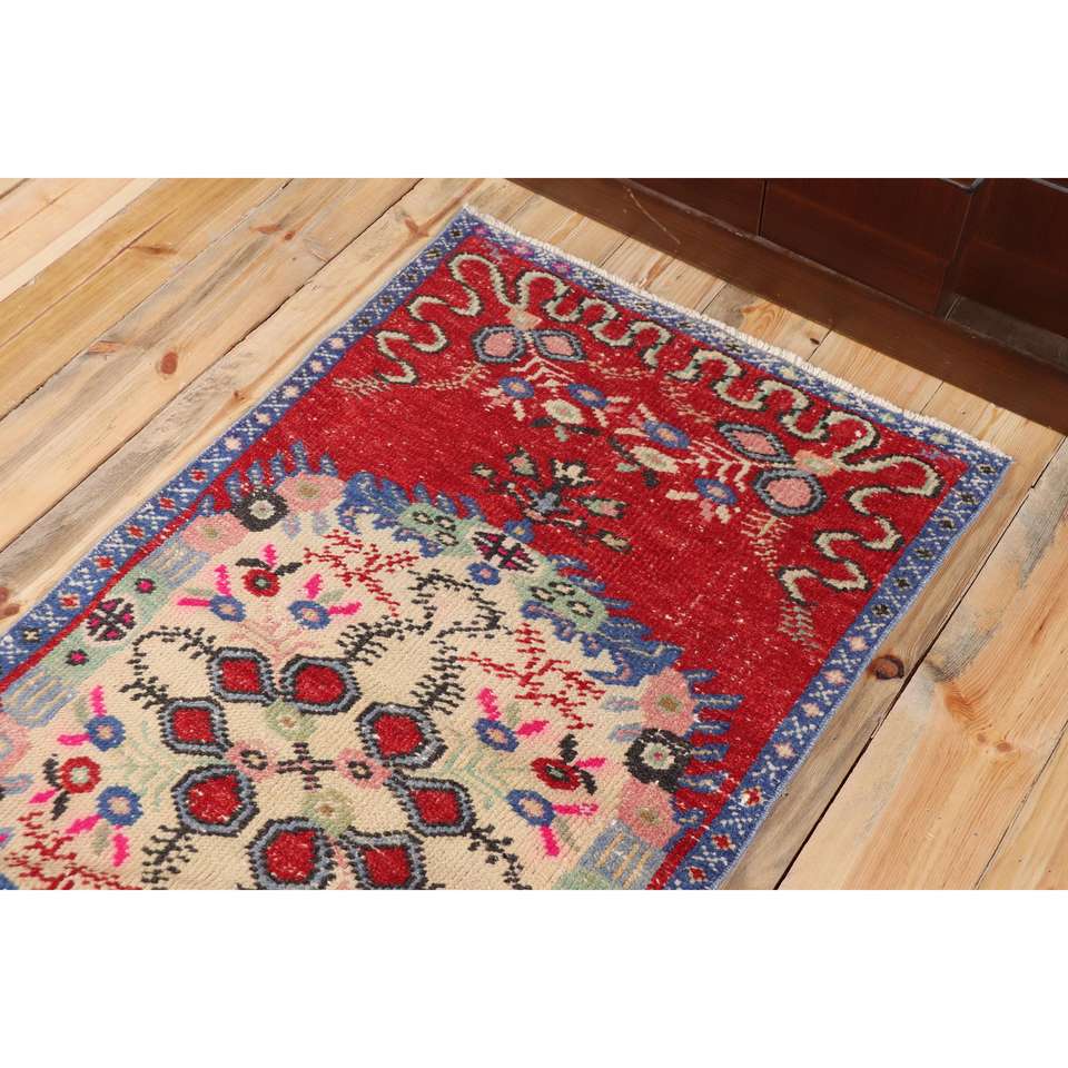 Turkish Eco-Friendly Rug 2.4x5.2 ft Small Red Patchwork Wool Vintage Rug with Latex Backing