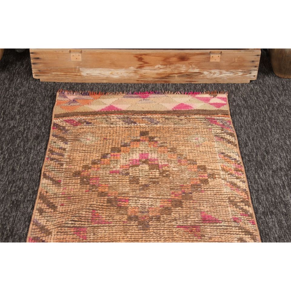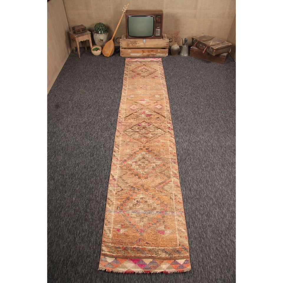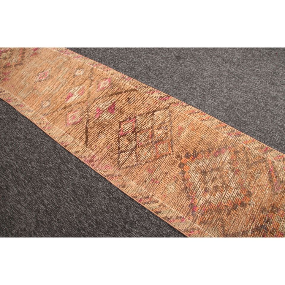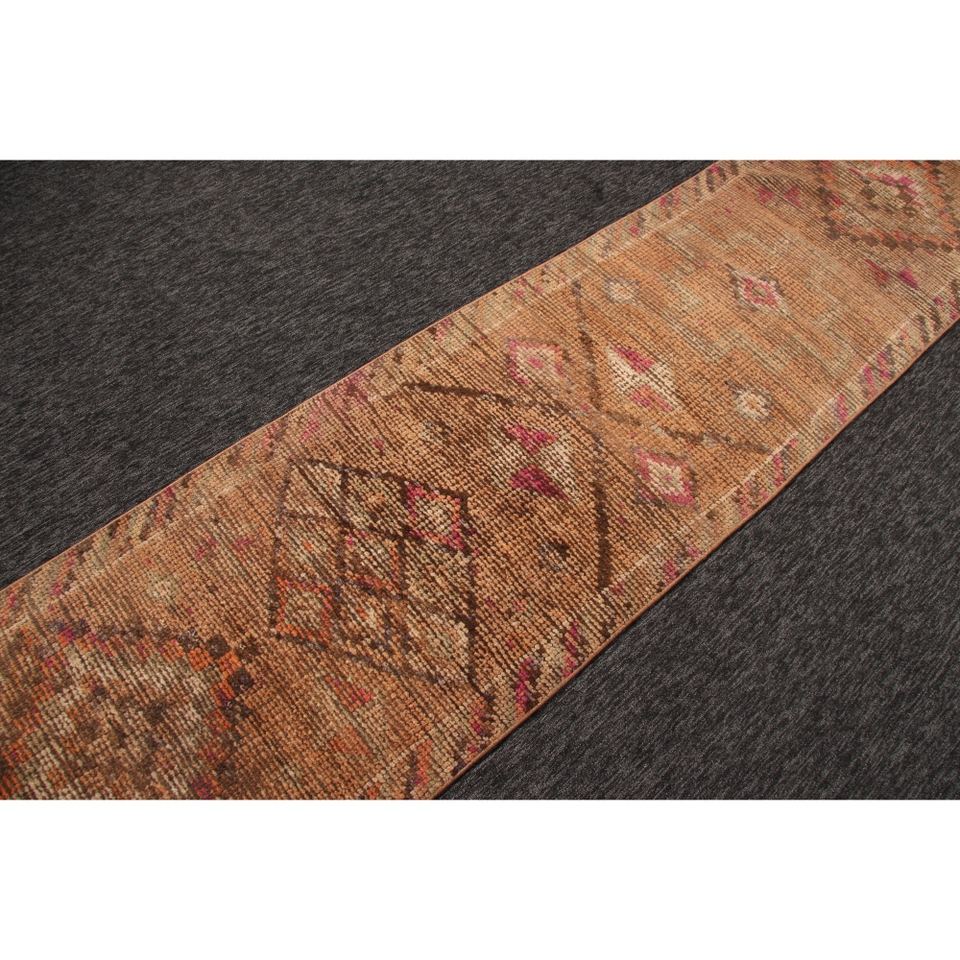 Turkish Wool Rug Eco-Friendly Traditional Design 2.5x12.8 ft Small Rug Orange Brown Herki Patchwork Latex Backing