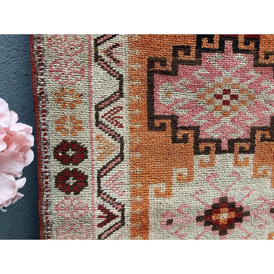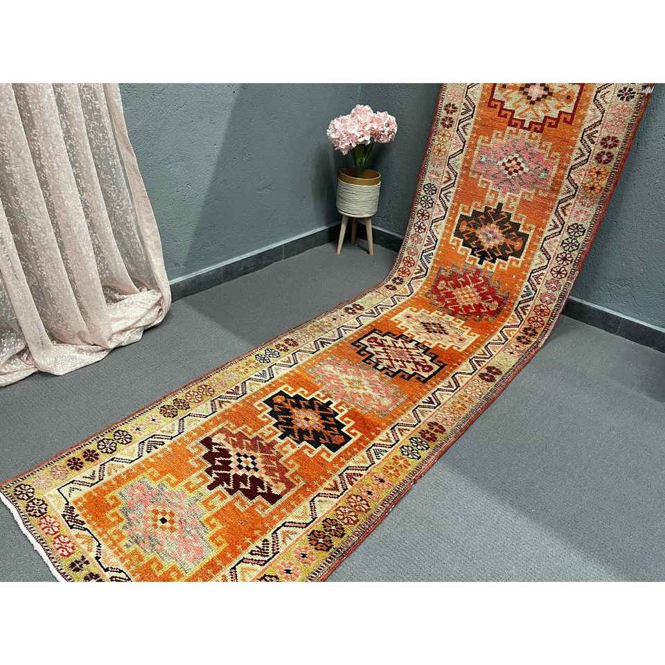 Turkish Rug, 2.7x12.2 ft Runner Vintage Rug, Herki Orange Brown Solid Rug
