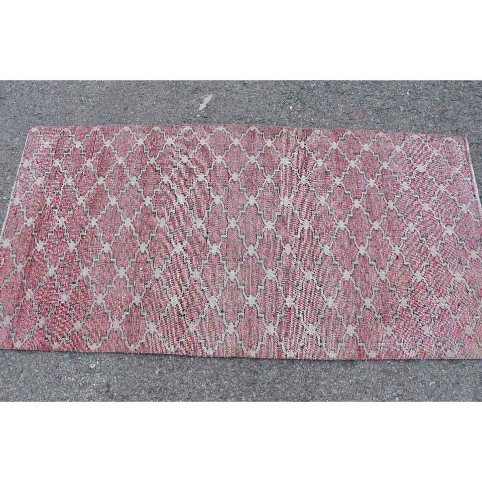 Turkish Rug 2.9x5.8 ft, Red White Check Wool Vintage Rug