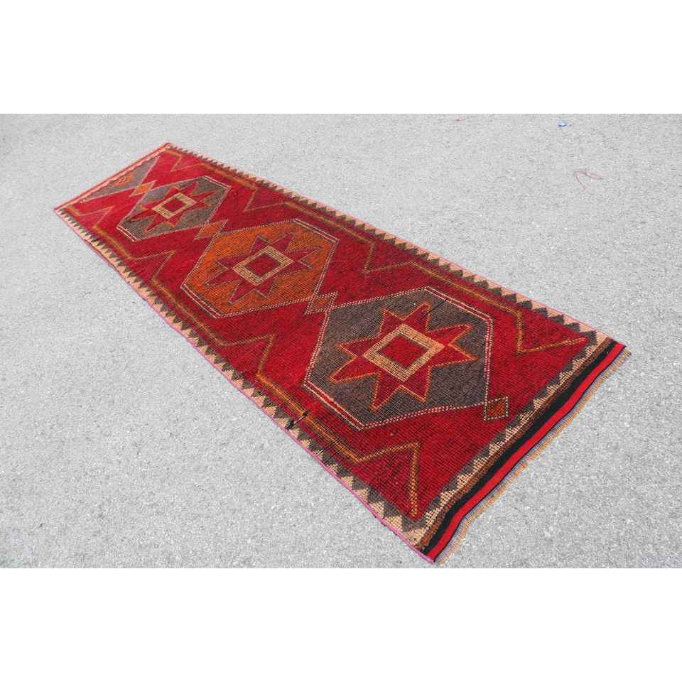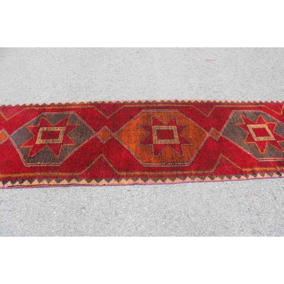 Turkish Runner Rug, 3.2x10.6 ft Vintage Rug, Red Herki Wool Rug