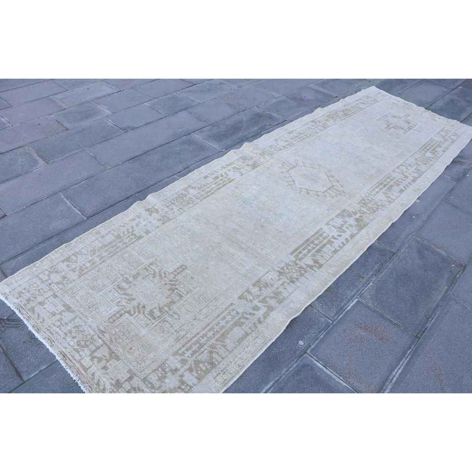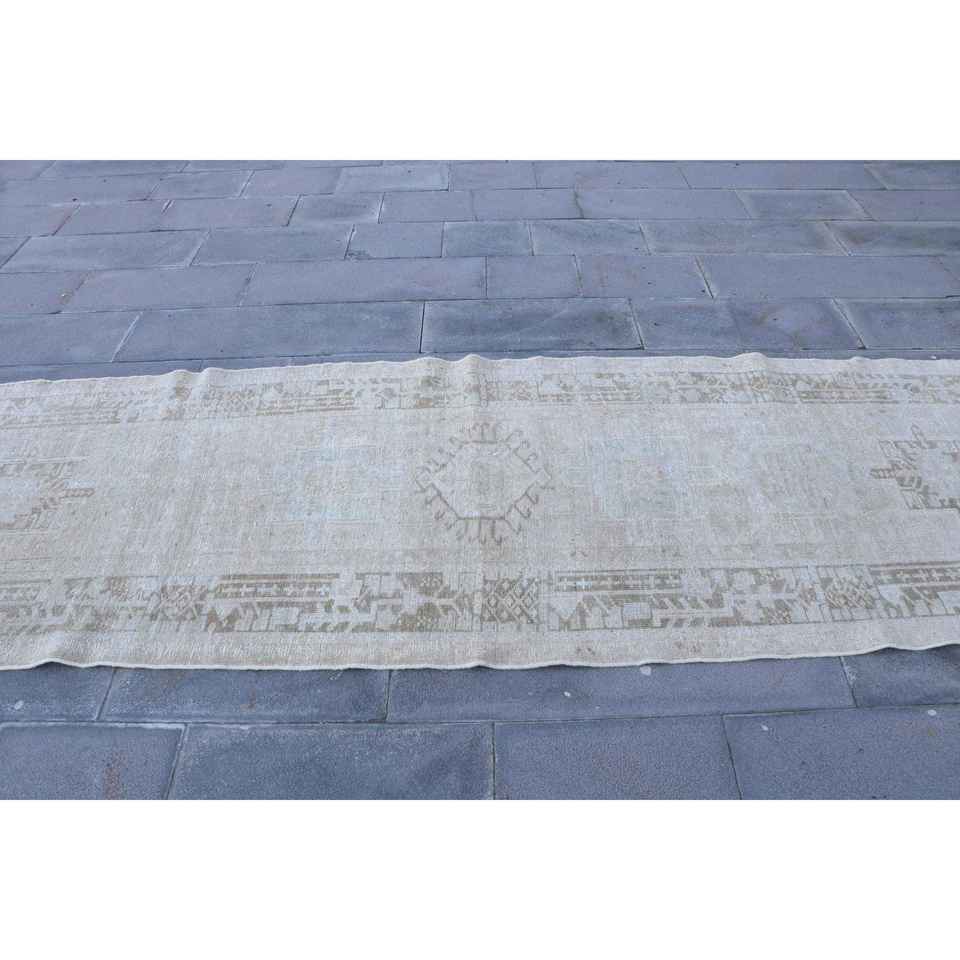 Turkish Runner Rug 3.3x10.3 ft, Vintage White Abstract Wool Rug