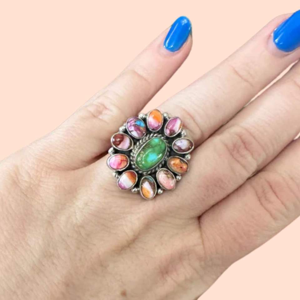 Turquoise Pink Oyster and Green Mohave Ring 925 Silver Ring Southwestern Design Crafted Silver Jewellery Wedding Party Wear