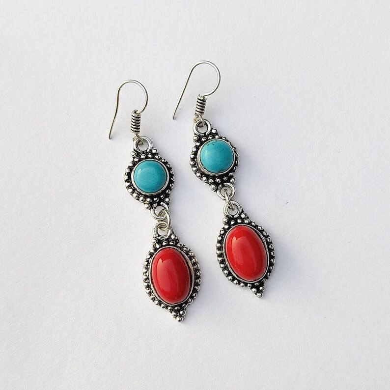 Turquoise & Red Coral Dangle Earrings Silver Plated Boho Jewelry Handmade Multi Stone Earrings Gift for Her Statement Drop