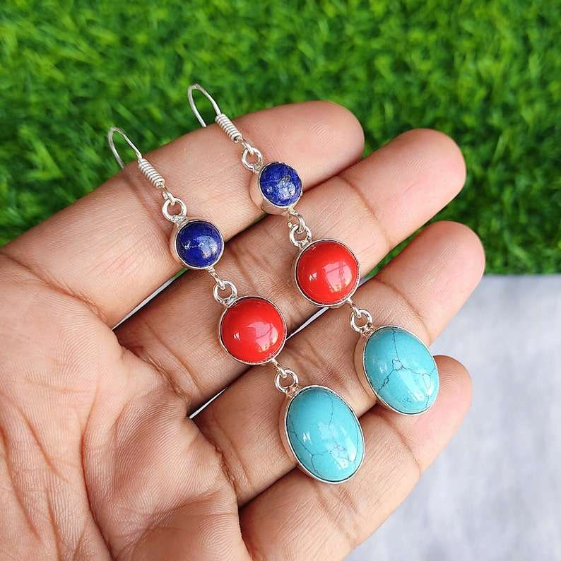 Turquoise Red Coral & Lapis Multi Stone Dangle Earrings 925 Silver Plated Ear Wire Handmade Boho Gemstone Jewelry Gift for Her
