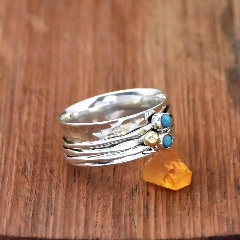 Turquoise Spinner Ring 925 Sterling Silver Hammered Meditation Fidget Ring Anniversary Gift for Her