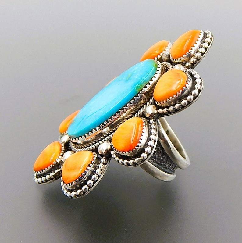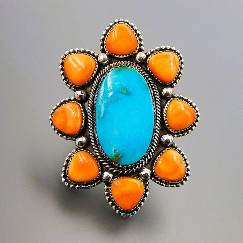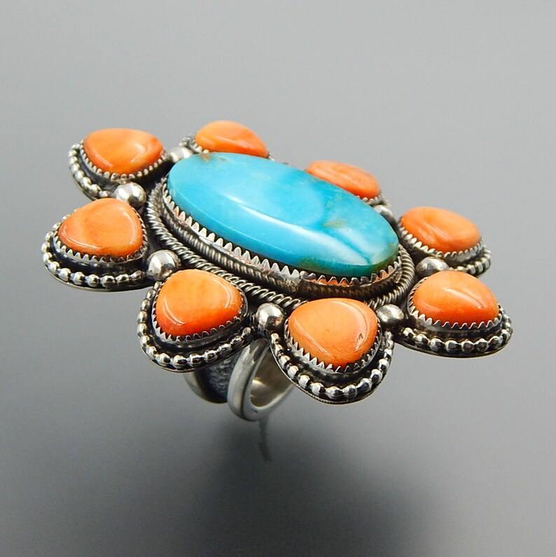 Turquoise Spiny Oyster Sterling Silver Huge Cluster Ring Natural Gemstone Trendy Women's Gift for Wedding Birthday Anniversary
