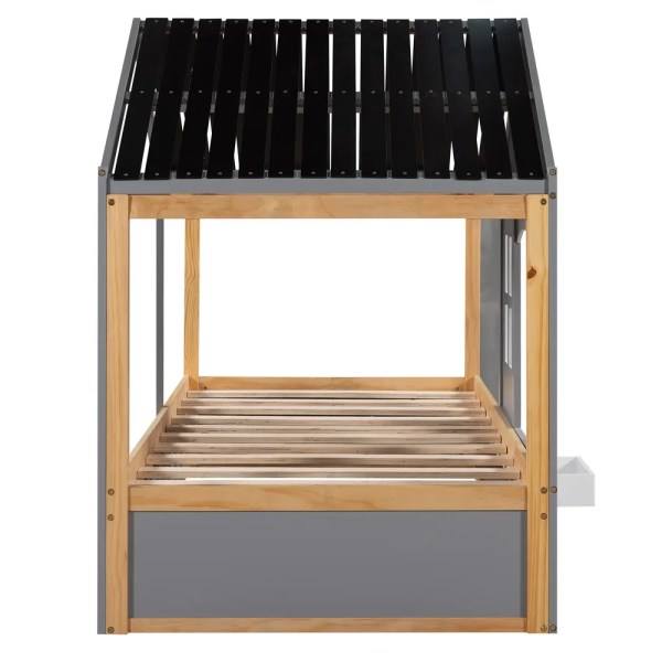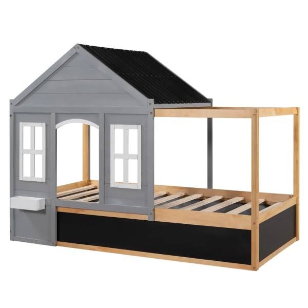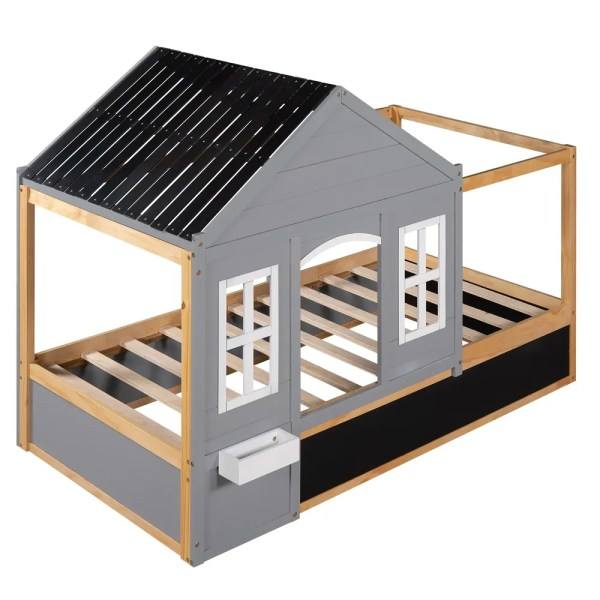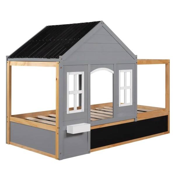 Twin Size House Shaped Canopy Bed for Kids Black Roof & White Window Gray Blackboard Little Shelf Wood Bunk Bed OEM Available