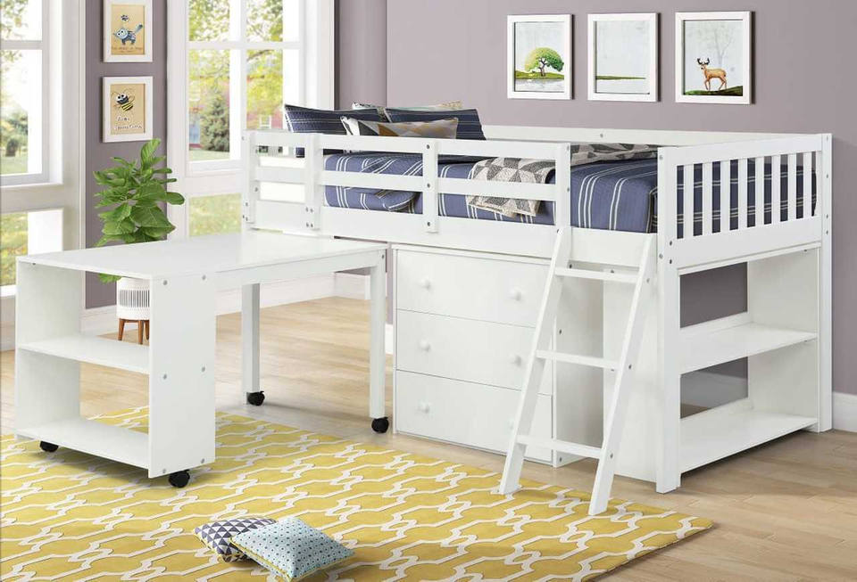 Construction:Pull out desk, built in shelves and drawers, guardrails, sturdy ladder