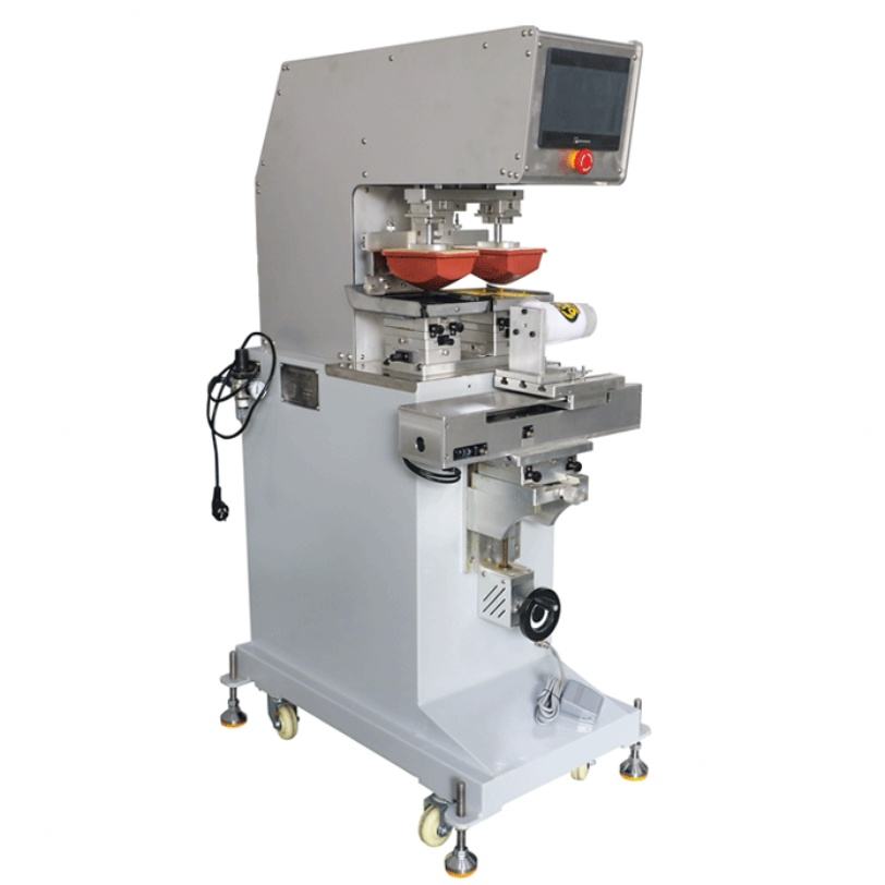Two-Color Semi-Automatic Shuttle Pad Printer Large Format New Core Components for Catering Boxes & Tubes Used Condition