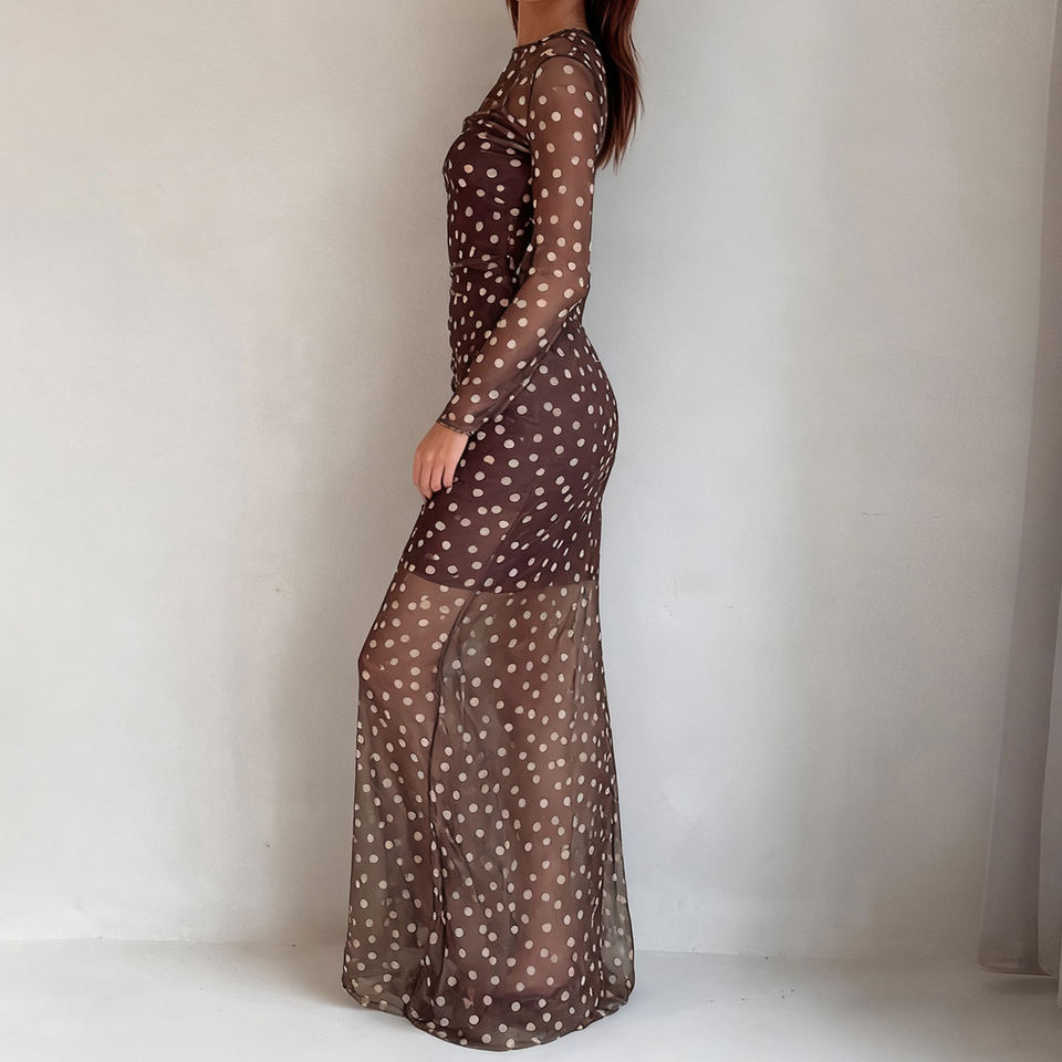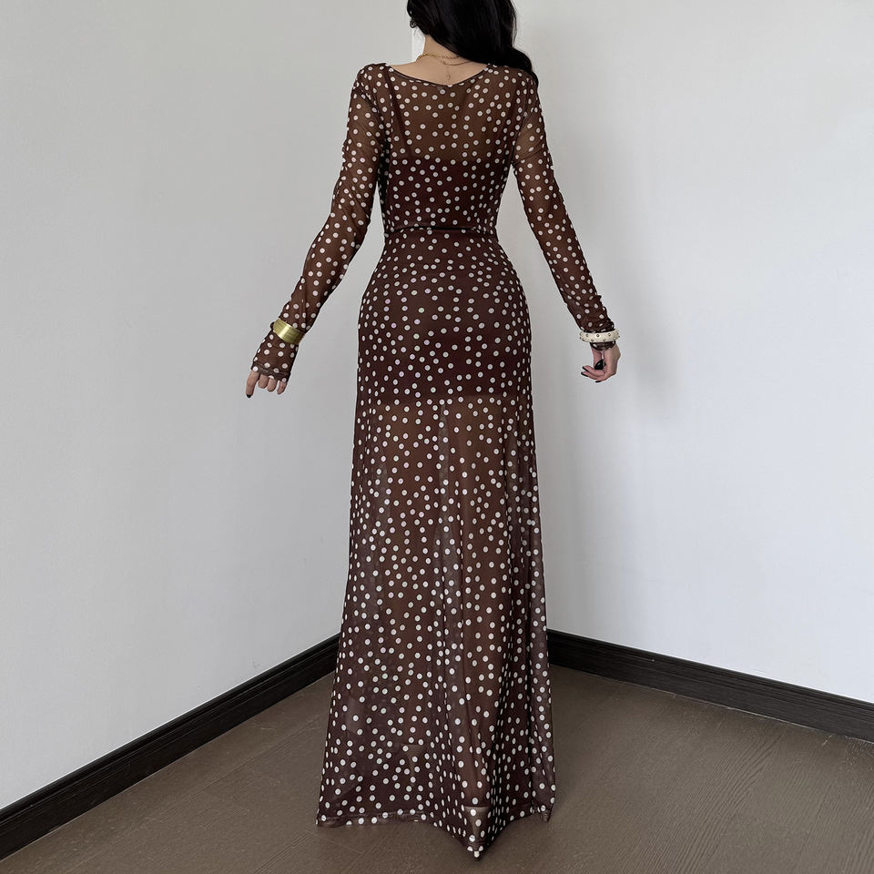 Two Piece Autumn Floor-Length Long Sleeve Dress Natural Waist Elegant Polka Dot Color Block Ruffle Eco-Friendly Breathable Mesh