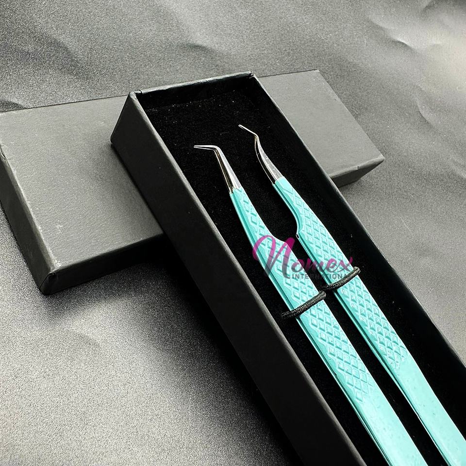 Two Pieces Pair Professional Eyelash Tweezers Stainless Steel Powder Coated Sky Blue Diamond Grip 90 Degree Double Angled