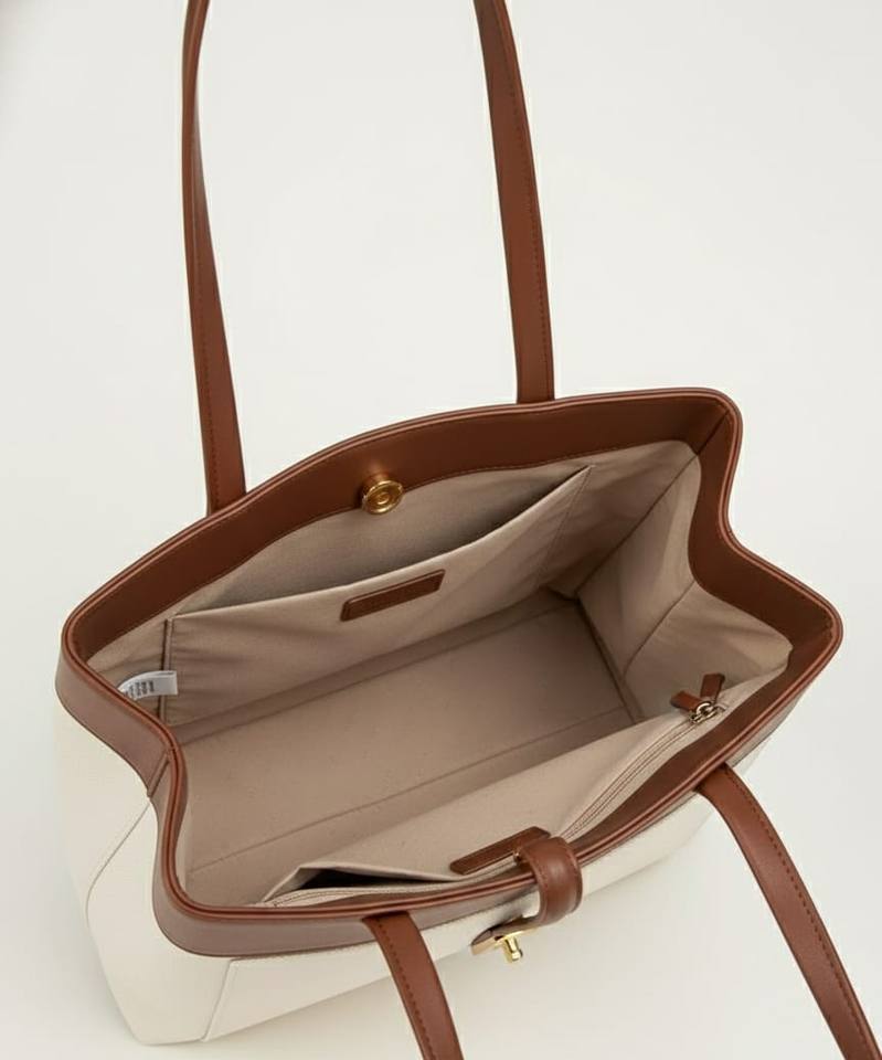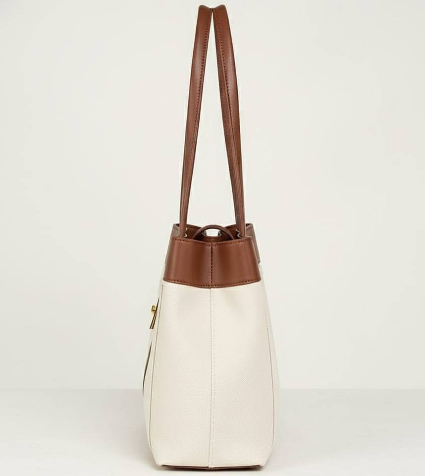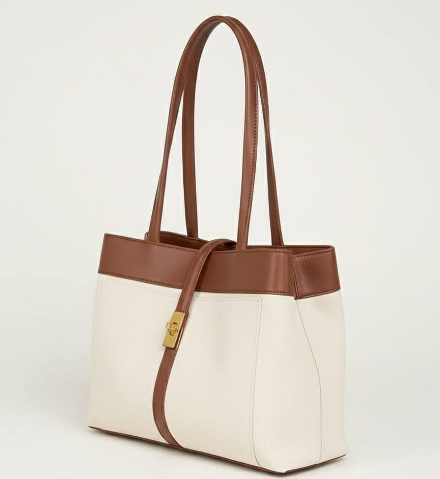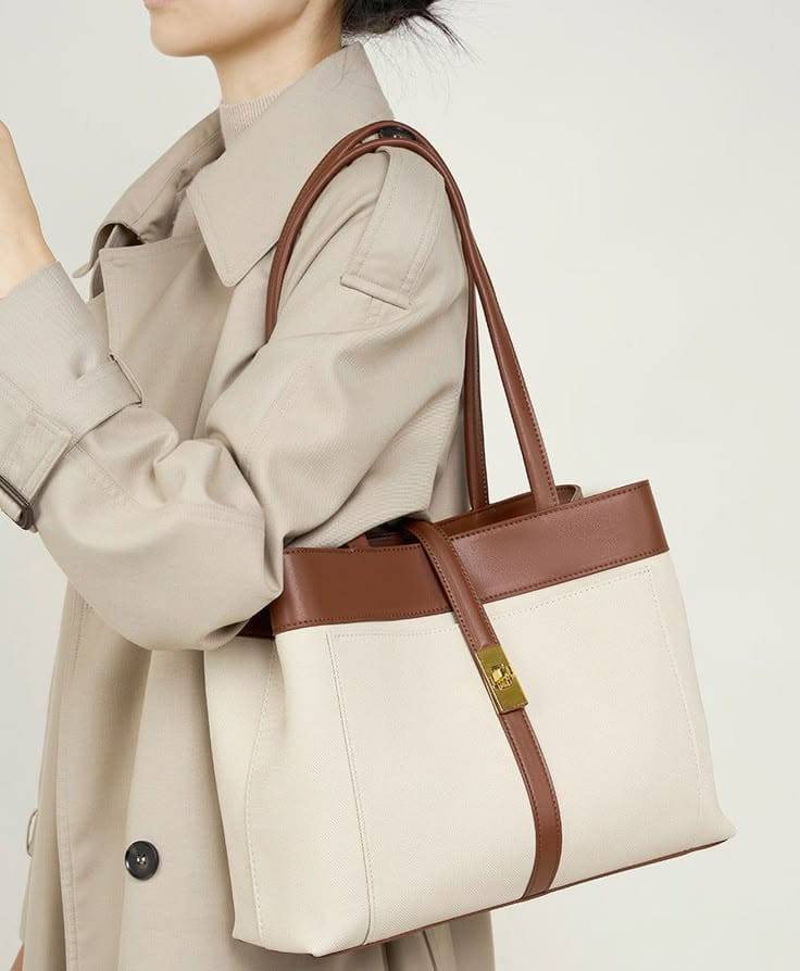 Two Tone Cream Brown Leather Candy Water Resistant Women's Luxury Tote Bag Shoulder Purse Large Work Handbag Gold Turn Lock