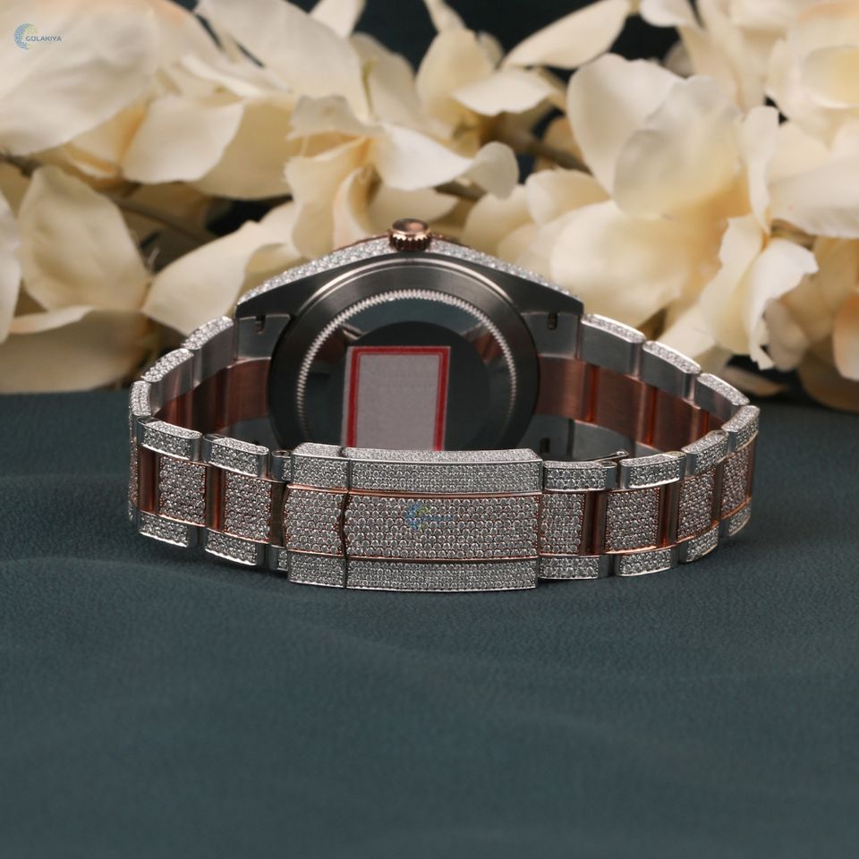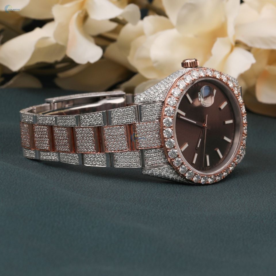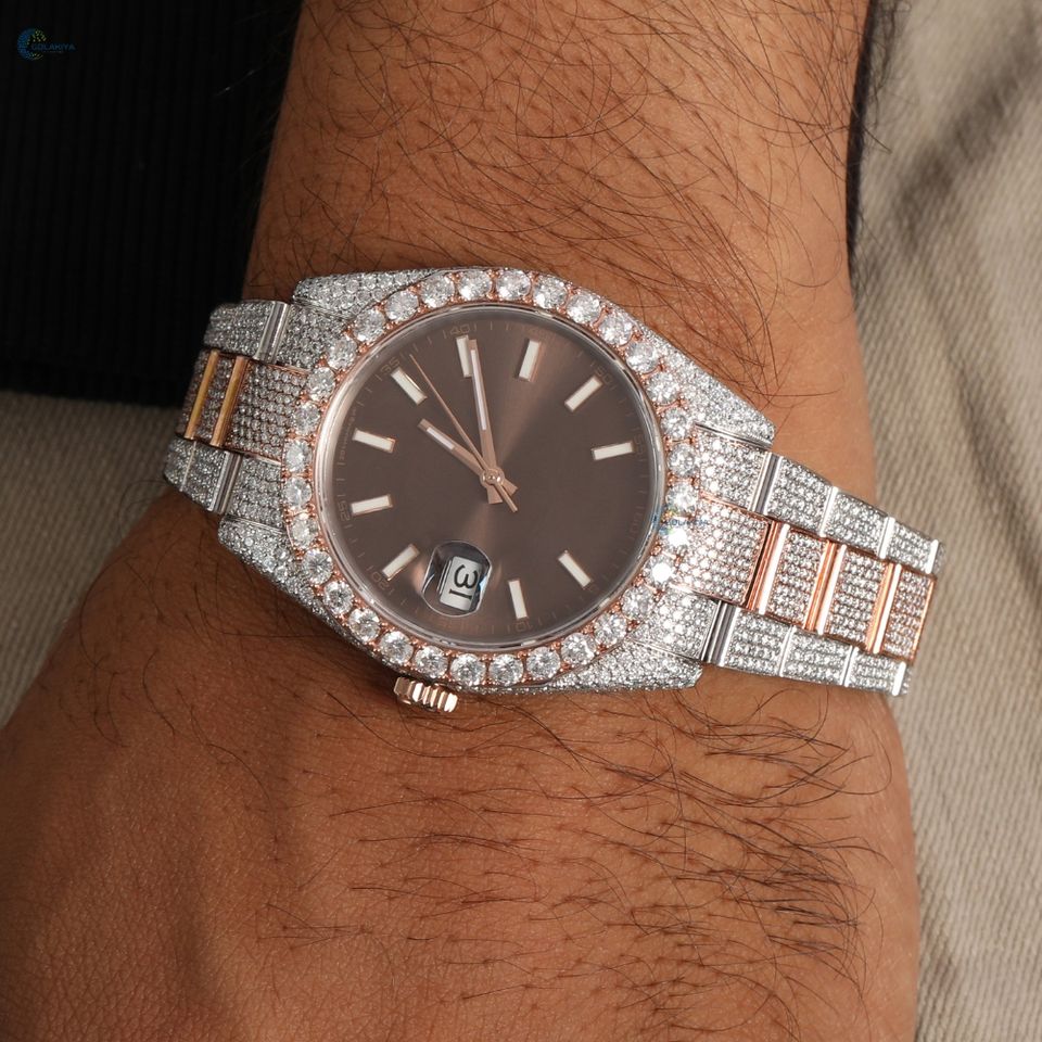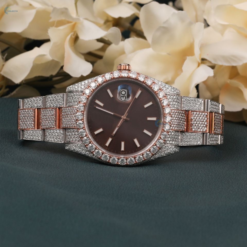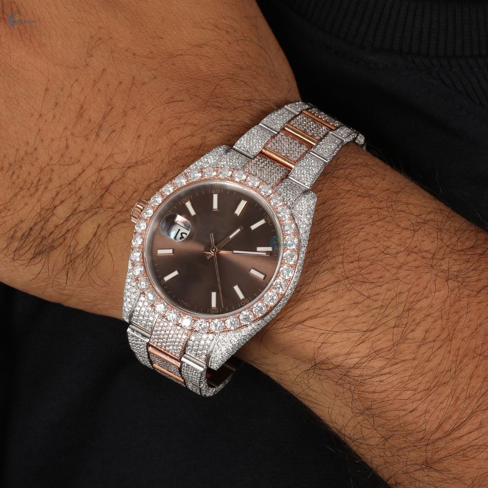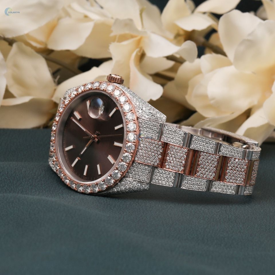 Two Tone Iced Out Moissanite Watch Elegant Stylish Brown Dial Wrist Watch Luxury Hip Hop Watch