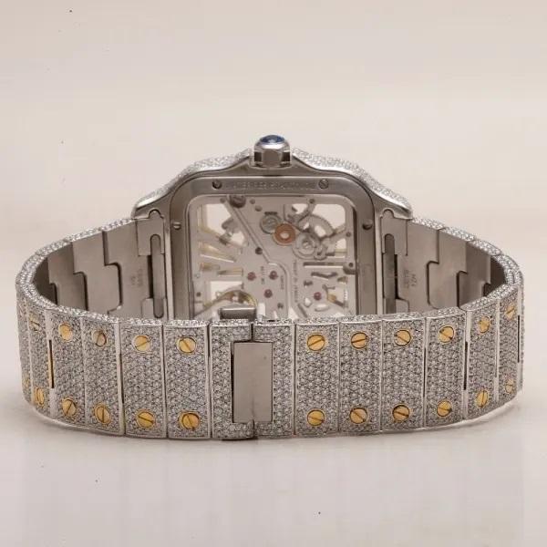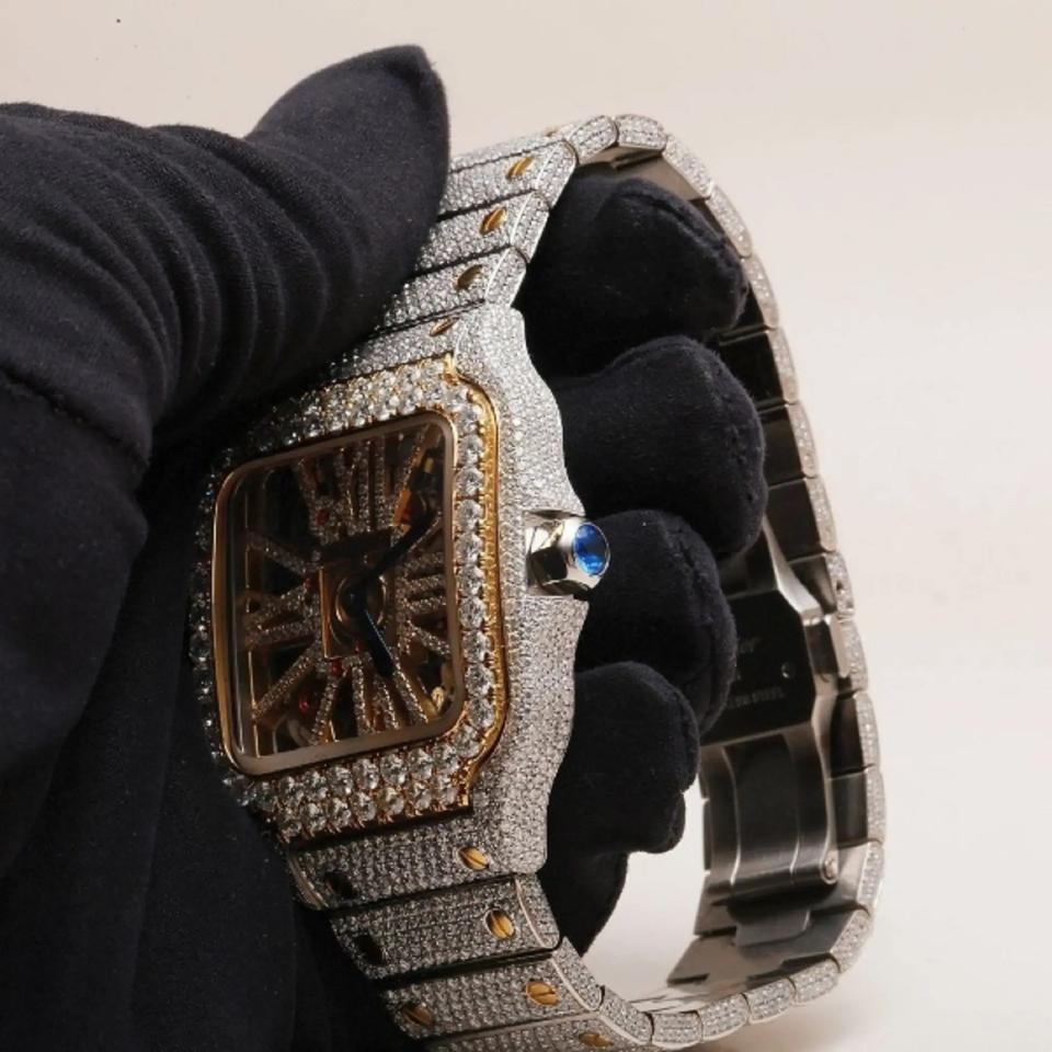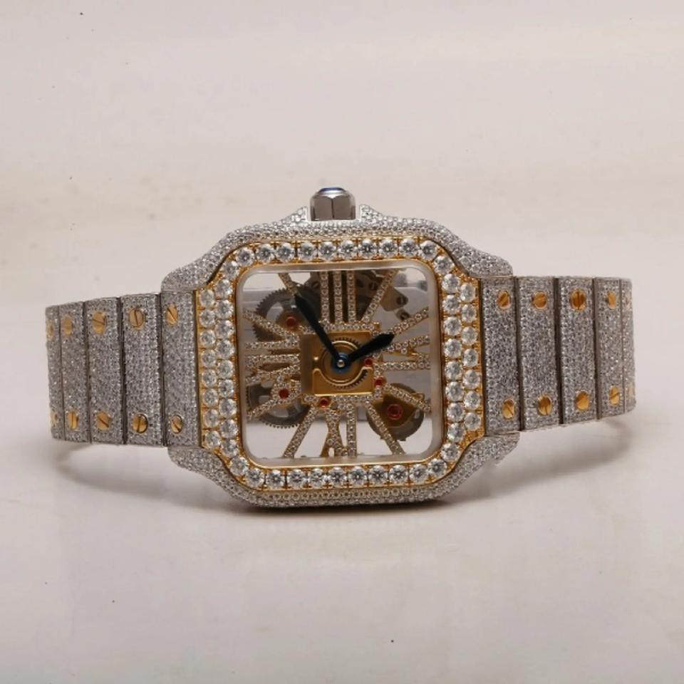 Two Tone Iced Out Skeleton Luxury Stainless Steel Hip Hop Vintage Gold Silver Square Square Mechanical Watch with Glass Dial