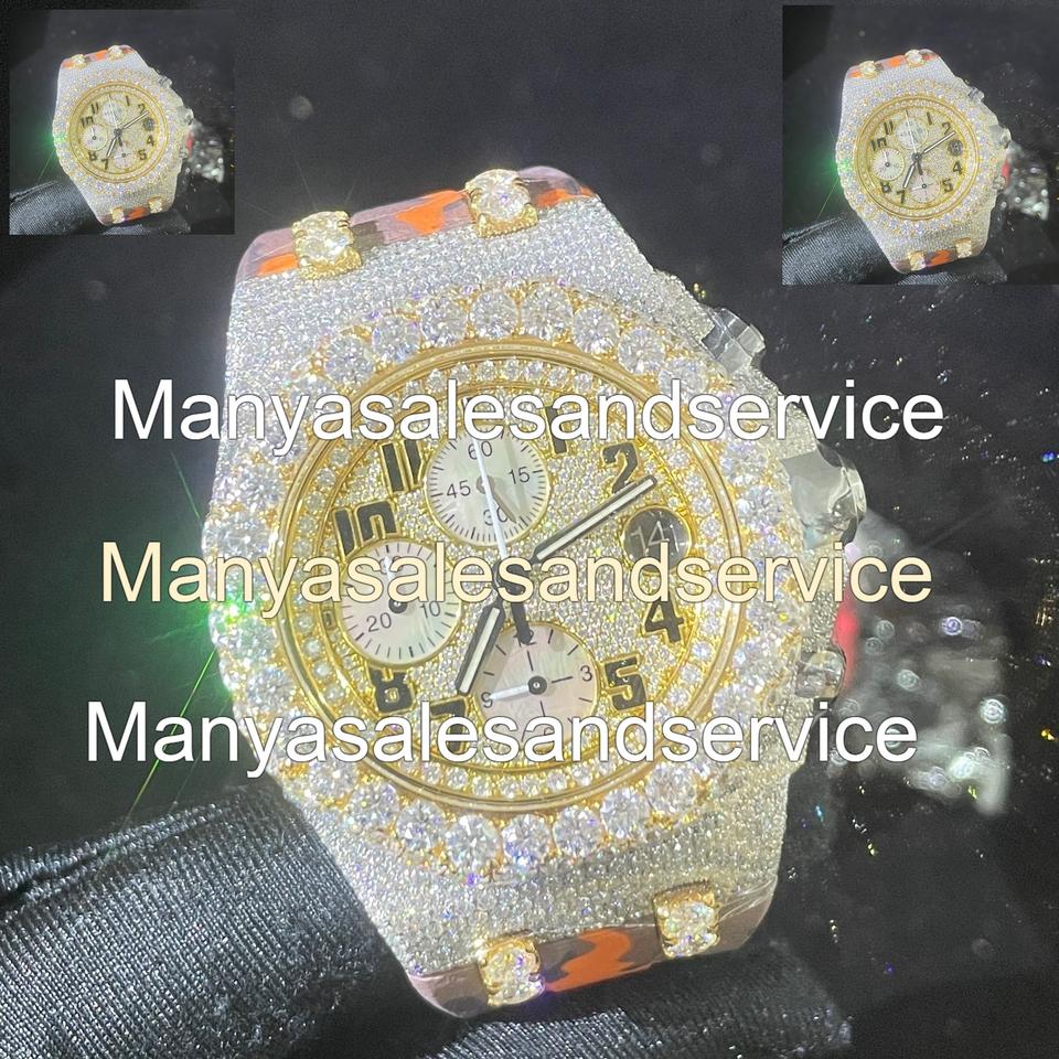 Two Tone Luxury Men's Stainless Steel & Moissanite Band Wrist Watch Half Iced Date Dial Fully Mechanical Watch