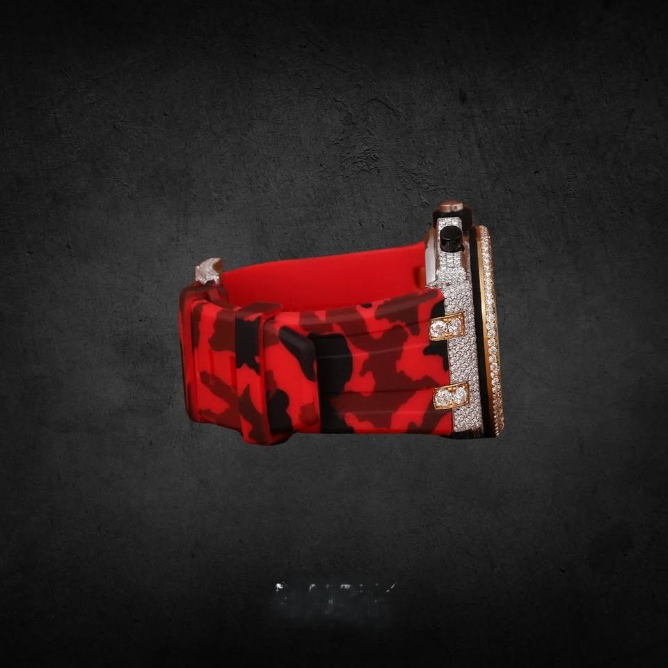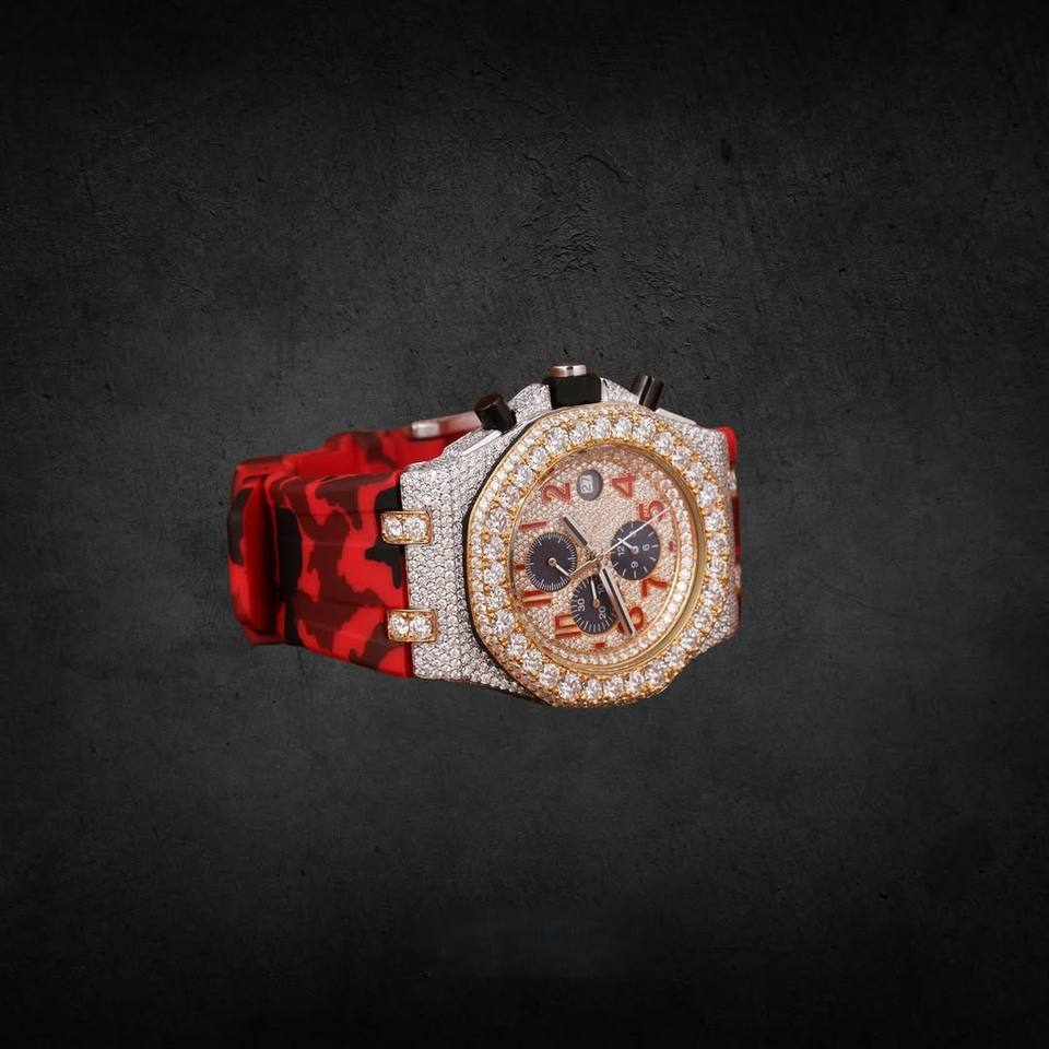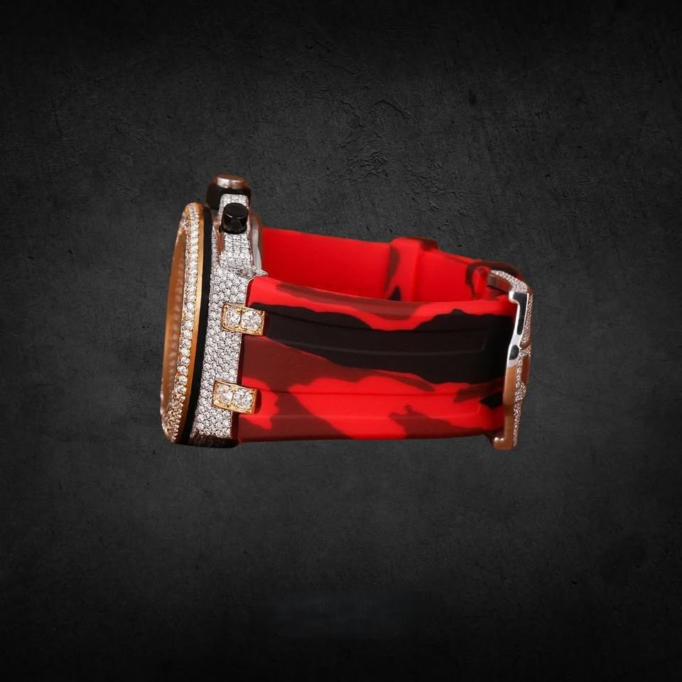 Two Tone Luxury Men's Stainless Steel Wrist Watch Half Iced Moissanite Diamond Red Black Rubber Strap Analog Date Fully
