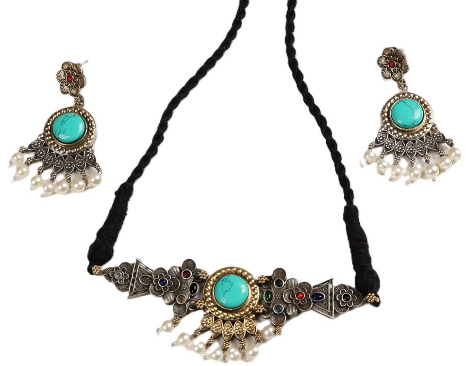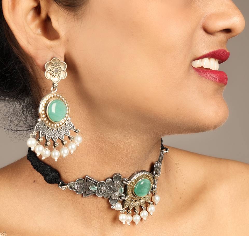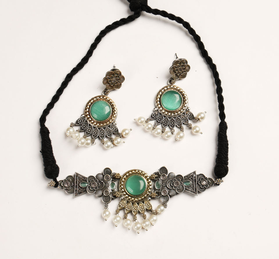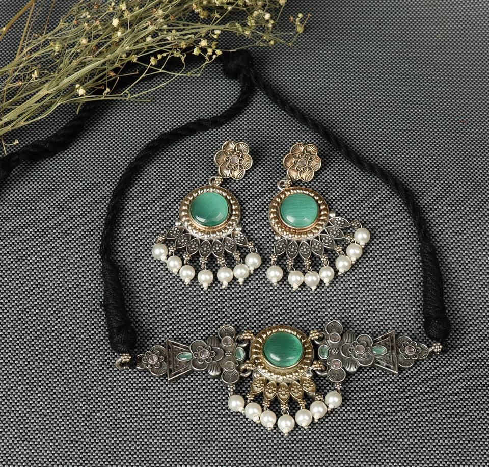 Two-Tone Oxidized Silver Gold Plated Bohemian Floral Choker Necklace Set with Green Stone Pearl Drop Earrings for Women Wedding