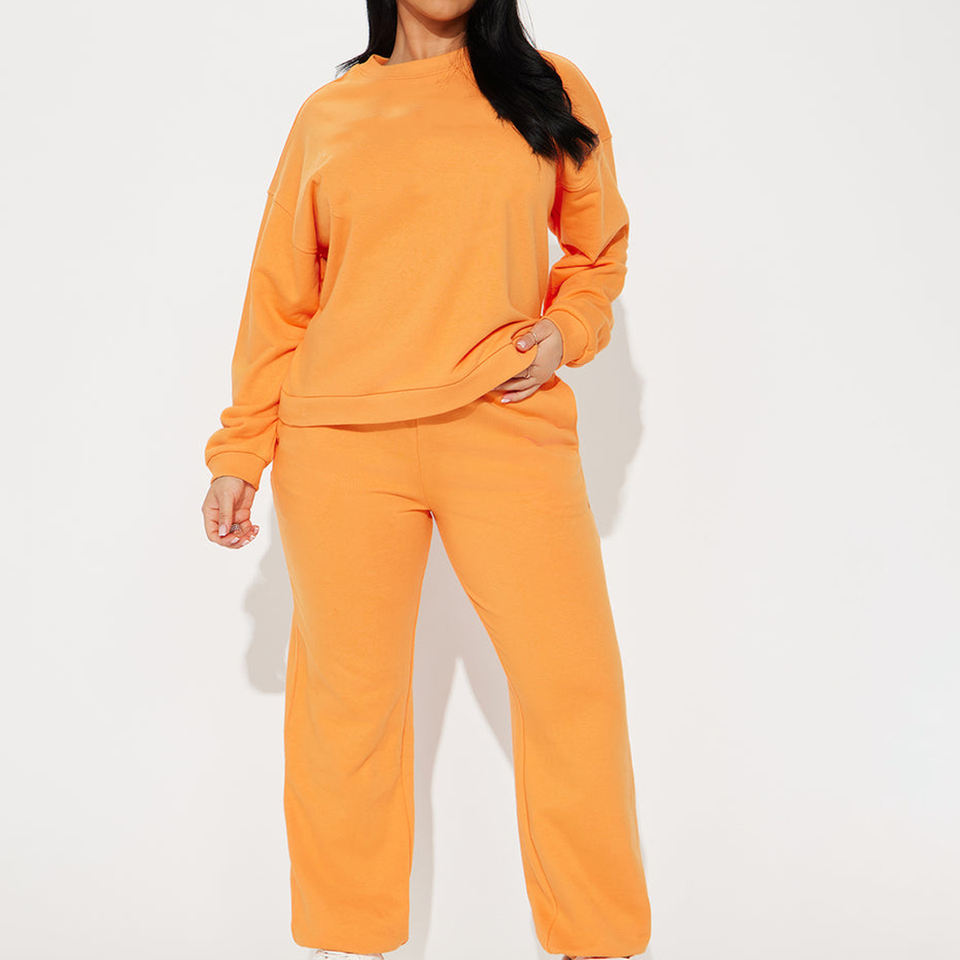 Two piece womens tracksuit set with orange quick dry sweatshirt and fleece joggers stylish outfit for workout or lounge wear