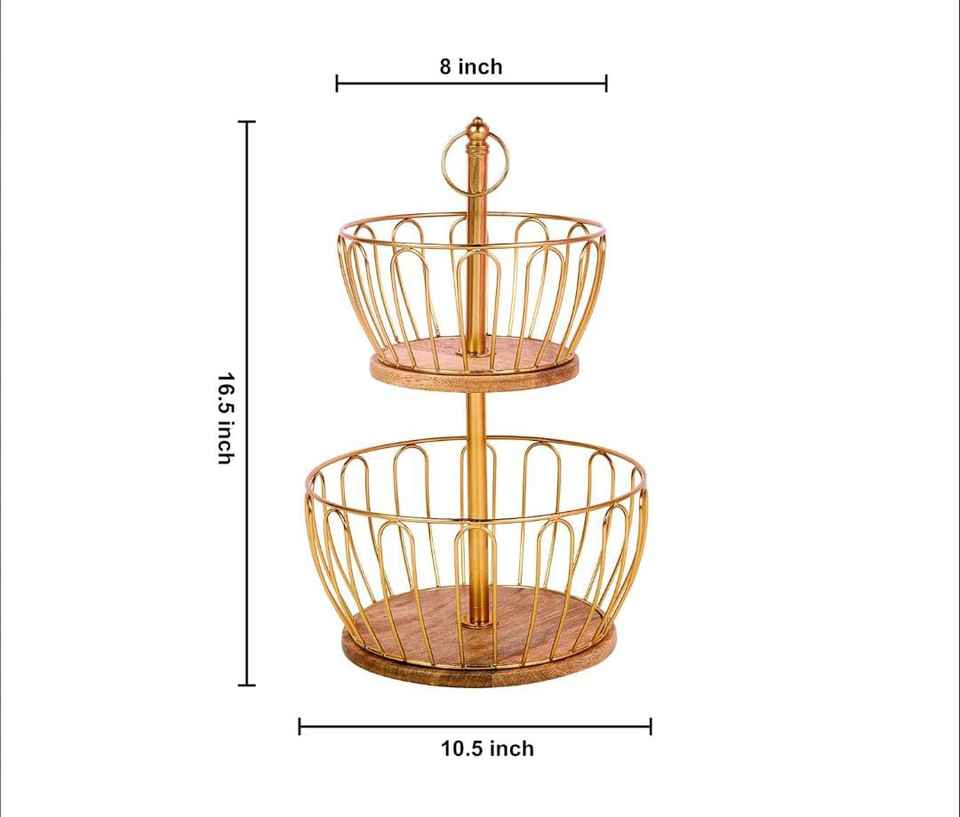 Two-Tier Gold Finished Metal Fruit Basket with Glass for Kitchen Dining Table Storage Rack for Fruit Display