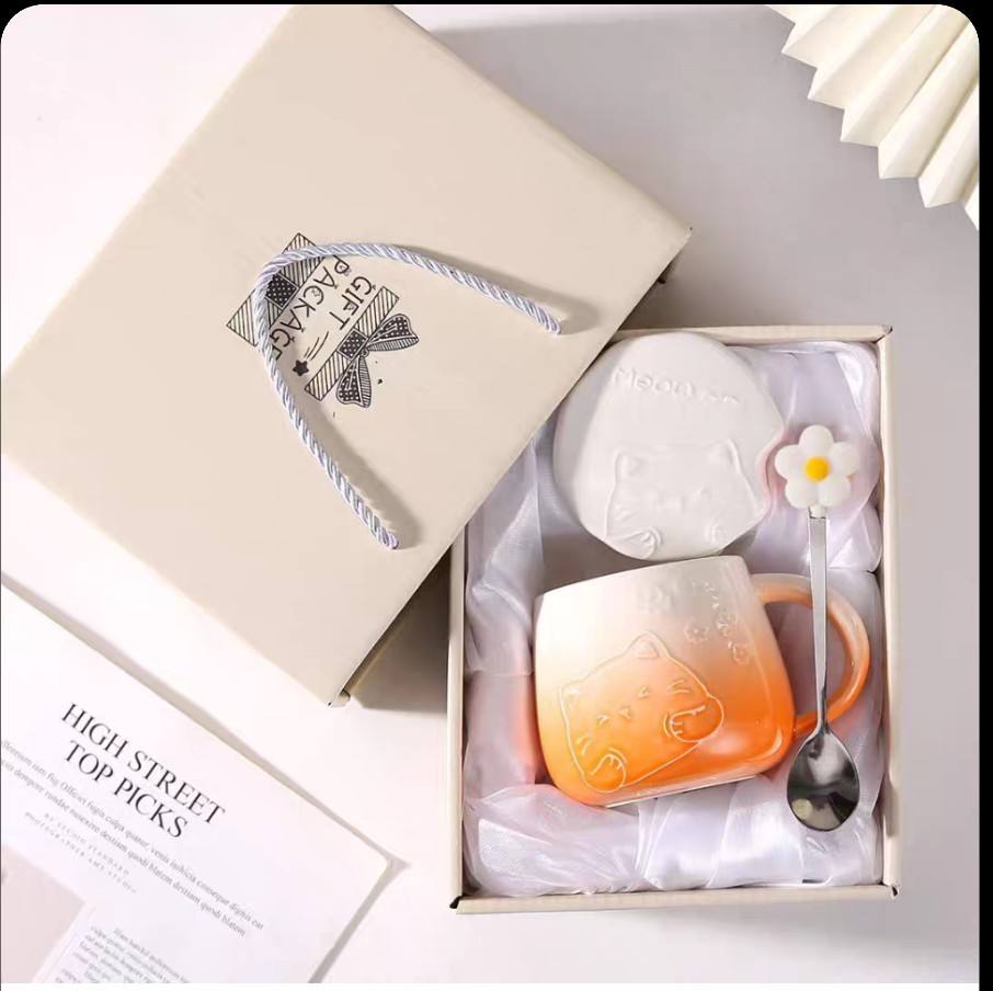 Two-tone Color Ceramic Coffee Tea Mug with Lid Spoon 400ml Capacity Gift Box Packaging Featuring an Embossed Cute Kitten Face