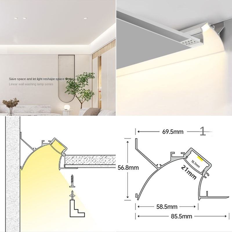 U-Shaped Concealed LED Frameless Profiles for Polarized Wall Washing Linear Light Slots in Bedroom Corridors
