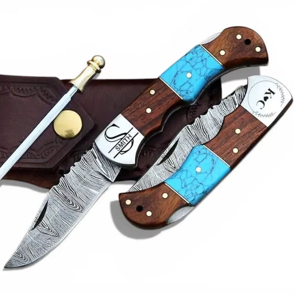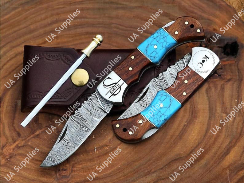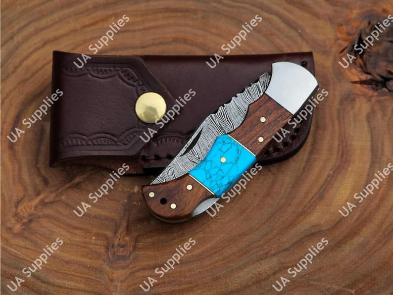 UA Supplies Custom Handmade Industrial Grade Damascus Steel Folding Knife Drop Point Blade Turquoise Wood Epoxy Handle Knife