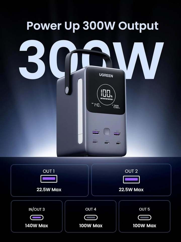 UGREEN 300W 48000mAh Portable Charger Power Bank With Smart Digital Display, Lighting and SOS Mode, 153Wh 5 Ports Battery Pack