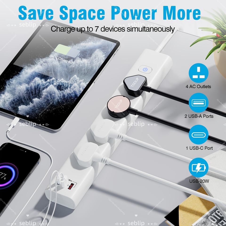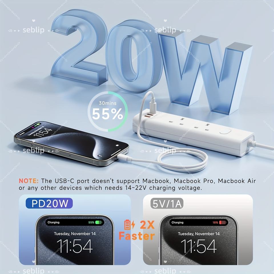 UK 3-Outlet Power Strip Adapter with PD20W USB Ports Extension Lead with Switch Indicator Light and Overload Protection