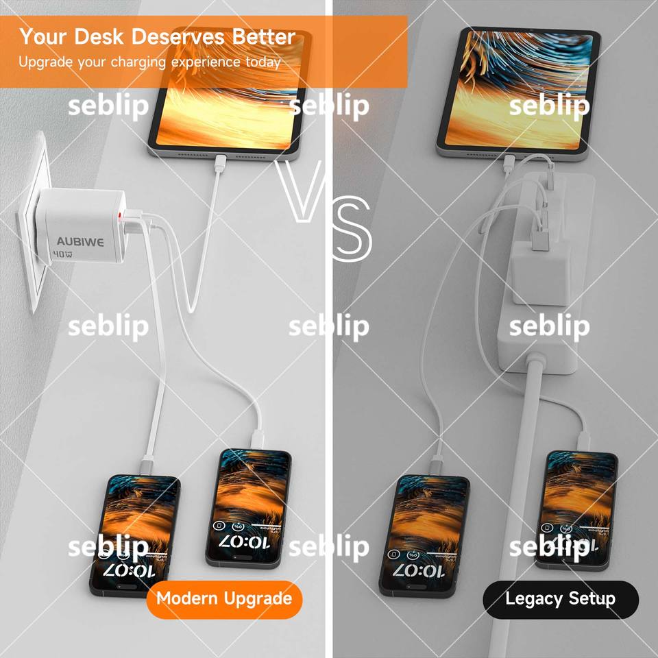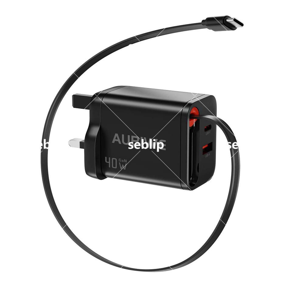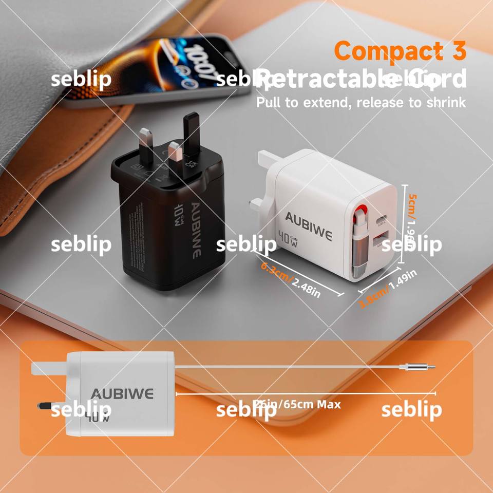 UK Plug 40W Wall Charger with Retractable Cable, High-Speed Charging for Multiple Devices, Space-Saving Design for Home & Travel