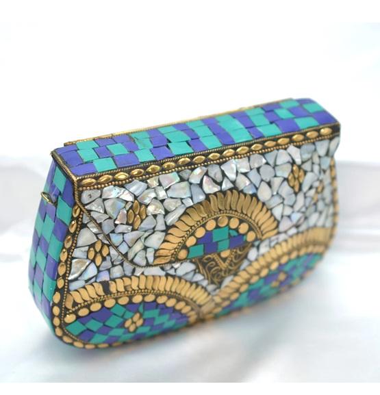 UNIQUE BAG Gold Dots & Mother of Pearl Hearts (resin) Accents Metal Evening Clutch Purse W/Strap