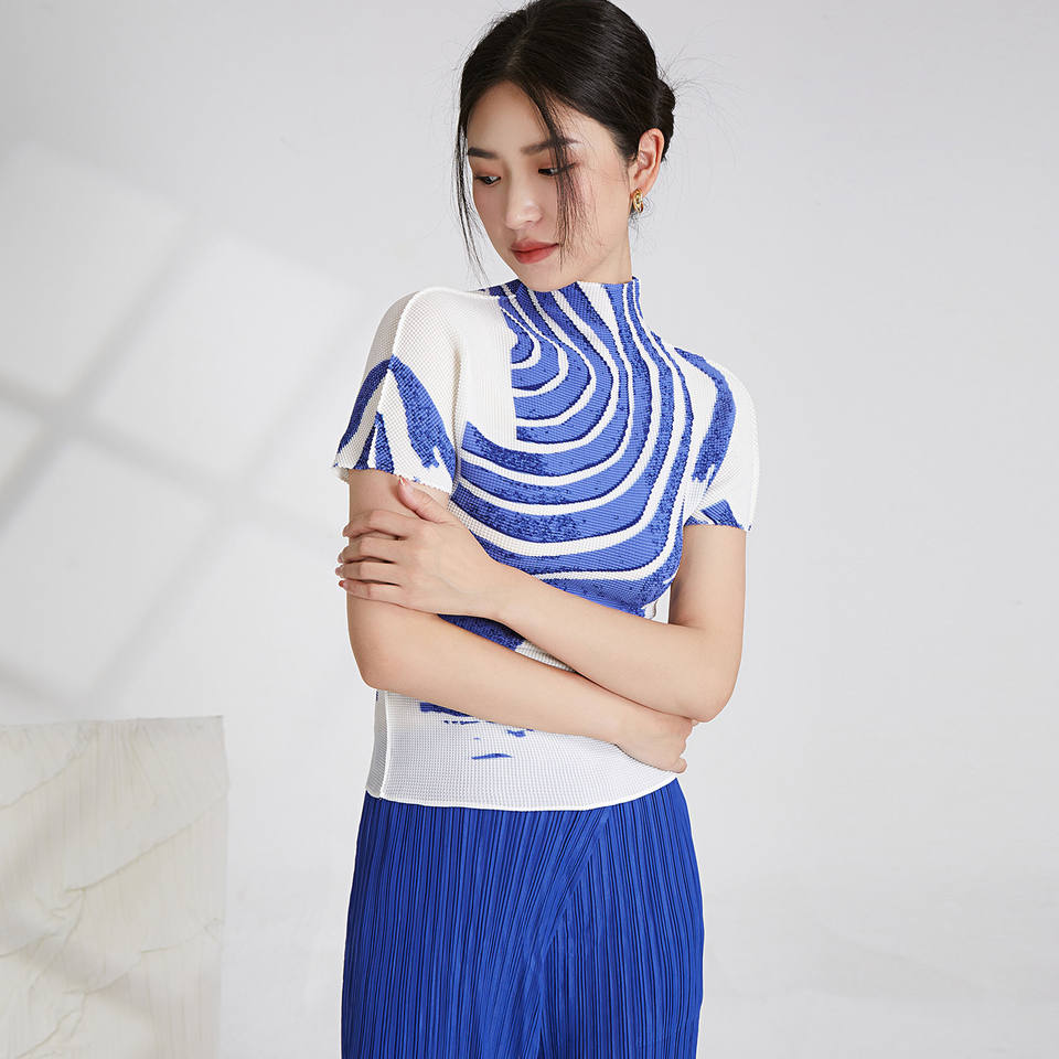US Hot Sale Short-sleeved Women's T-shirt High Elastic Pleated Women's Print Slim Fit Versatile Miyake Top Pullover