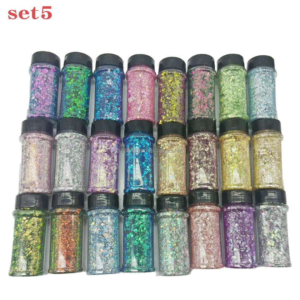 US Warehouses 2oz Bottle Mixed Size Laser Holographic Chunky Glitter 24 Colors Per Set for Snow Globe Tumbler Music Festivals